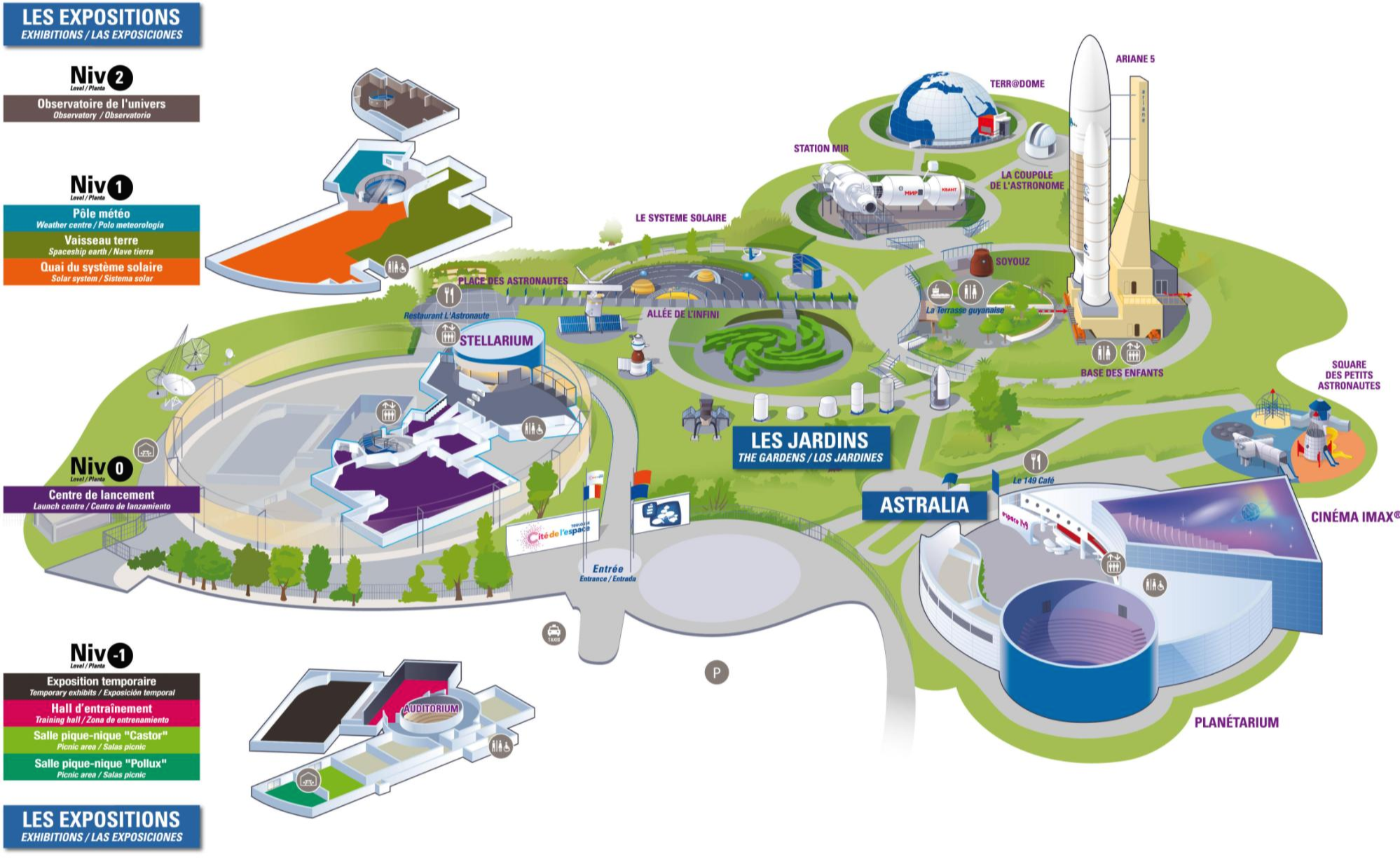 1997년에 개관한 이곳은 공간을 주제로 한 전시관, 아리안(Ariane) 우주선 복제품 및 야외전시물 등이 있는 정원, 그리고 아이맥스 및 플라네타륨 영상관인 아스트랄리아(Astralia)로 구성되어 있습니다.