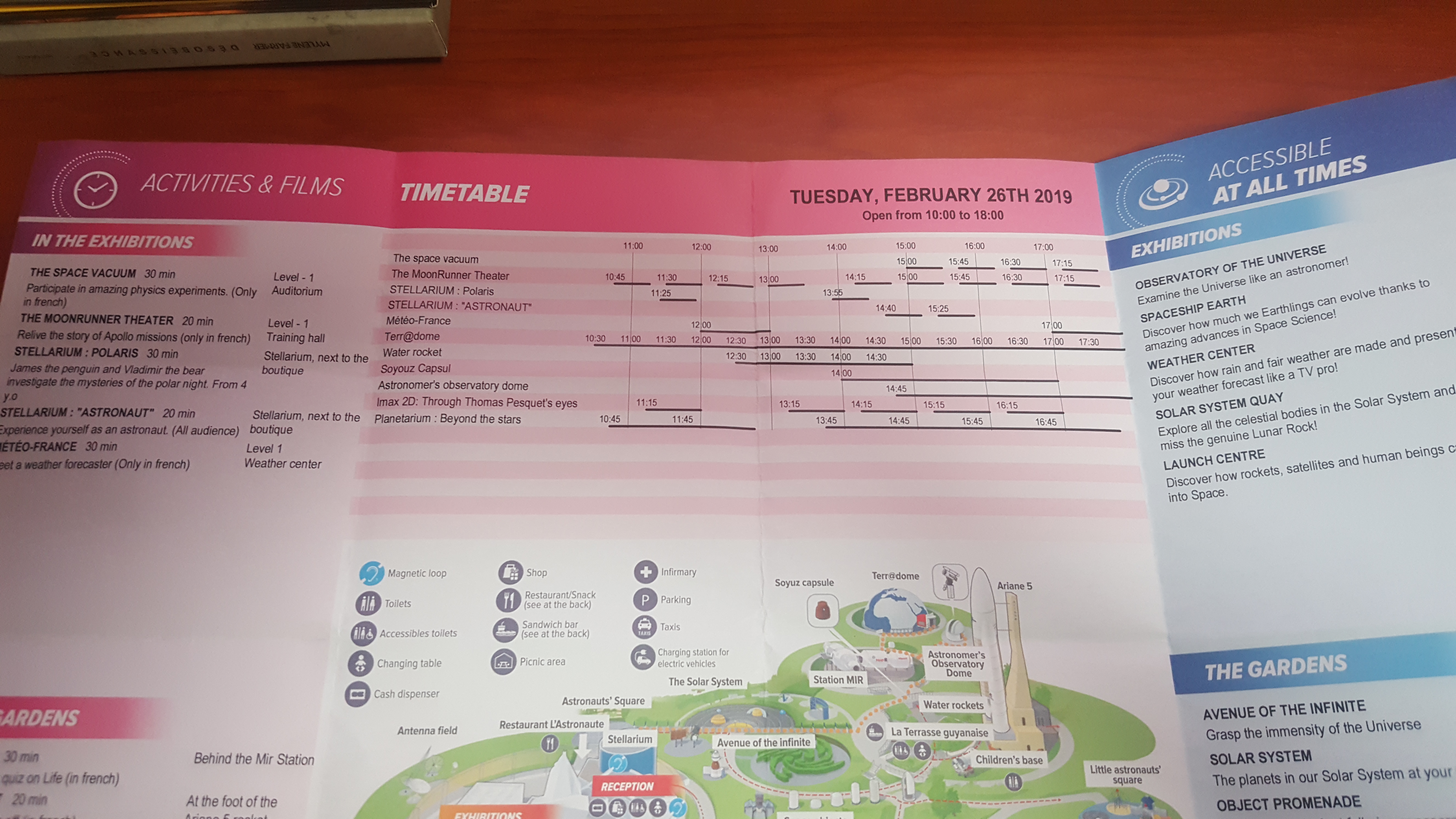 이 테마파크의 내부 이곳저곳에서 매일매일 시시각각 프로그램이 돌아가고 있는데, 달 중력 체험(Meeting Moon), 진공에 관한 실험영상(Space Vacuum), 소유즈 호 탑승체험(Soyouz Capsul), 물로켓 체험(Water Rocket), 망원경 관찰(Astronomer's Observatory Dome), 플라네타륨 등이 있고 일정기간이 지나면 조금씩 바뀌기도 합니다.