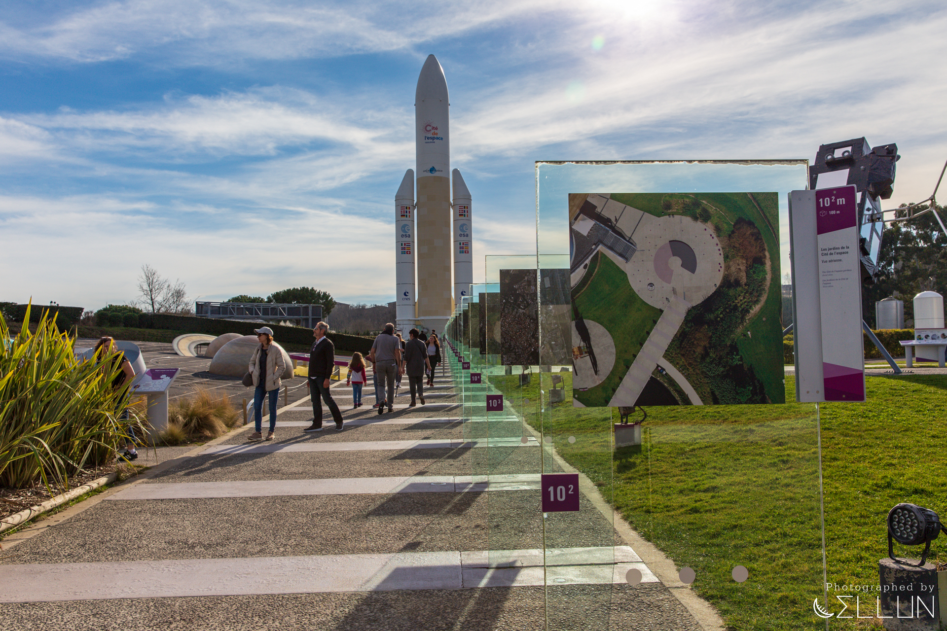 전시관을 나와서 정원으로 들어서면 우주선으로 가는 길목에 사진이 주루룩 나열된 것이 보이는데, 이것은 바로 툴루즈 이 장소에서부터 10거듭제곱 단위로 지상에서부터 멀어졌을 때의 모습을 연속적으로 보여주고 있습니다. 처음에는 바로 위에서 찍은 것 같다가 멀어질수록 항공사진, 그다음 위성사진, 더 멀어지면 지구 전체와 태양계, 은하, 마지막으로 우주의 끝까지... 우리 우주가 어느 정도 크기인지를 대략적으로 가늠할 수 있게 해줍니다.
