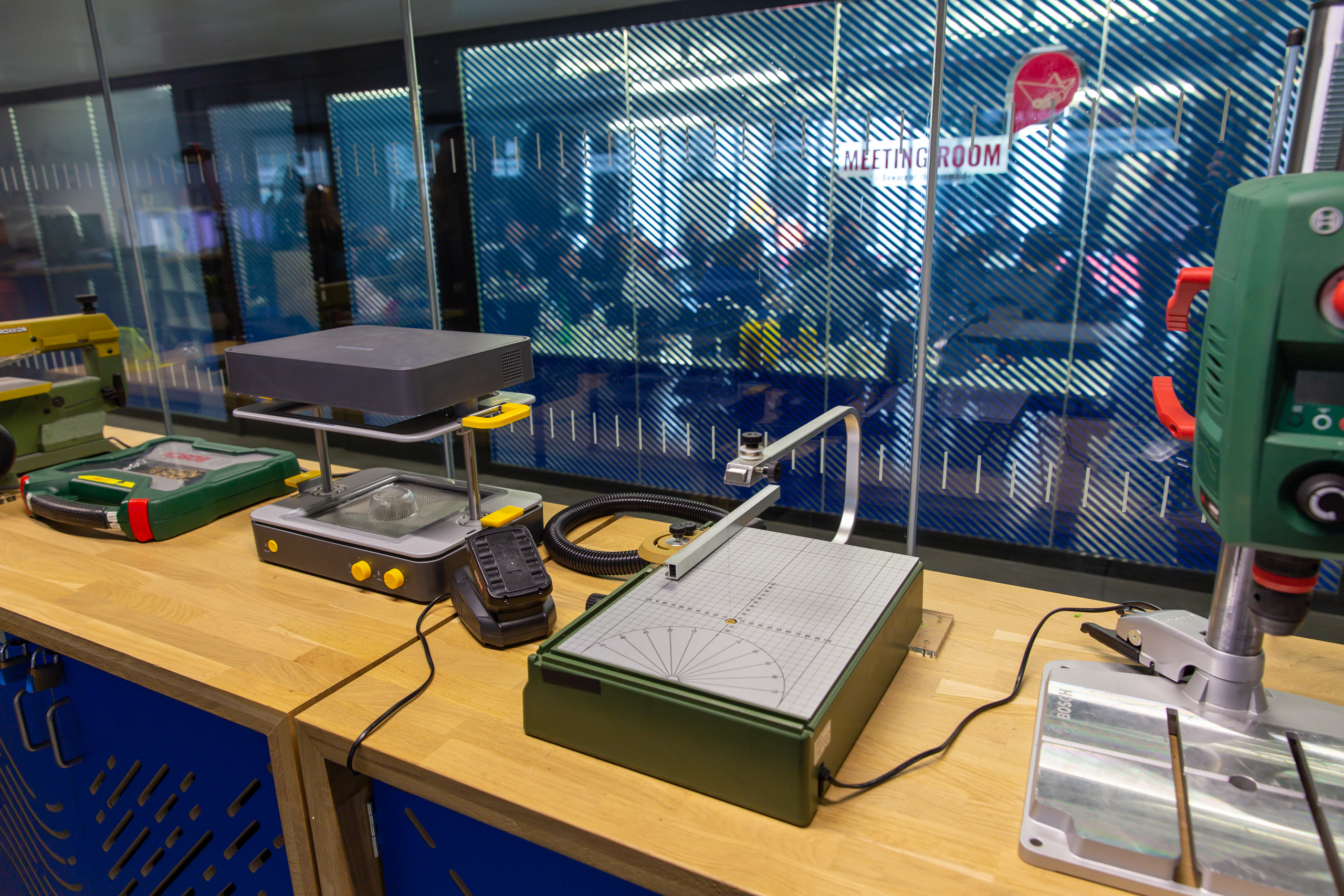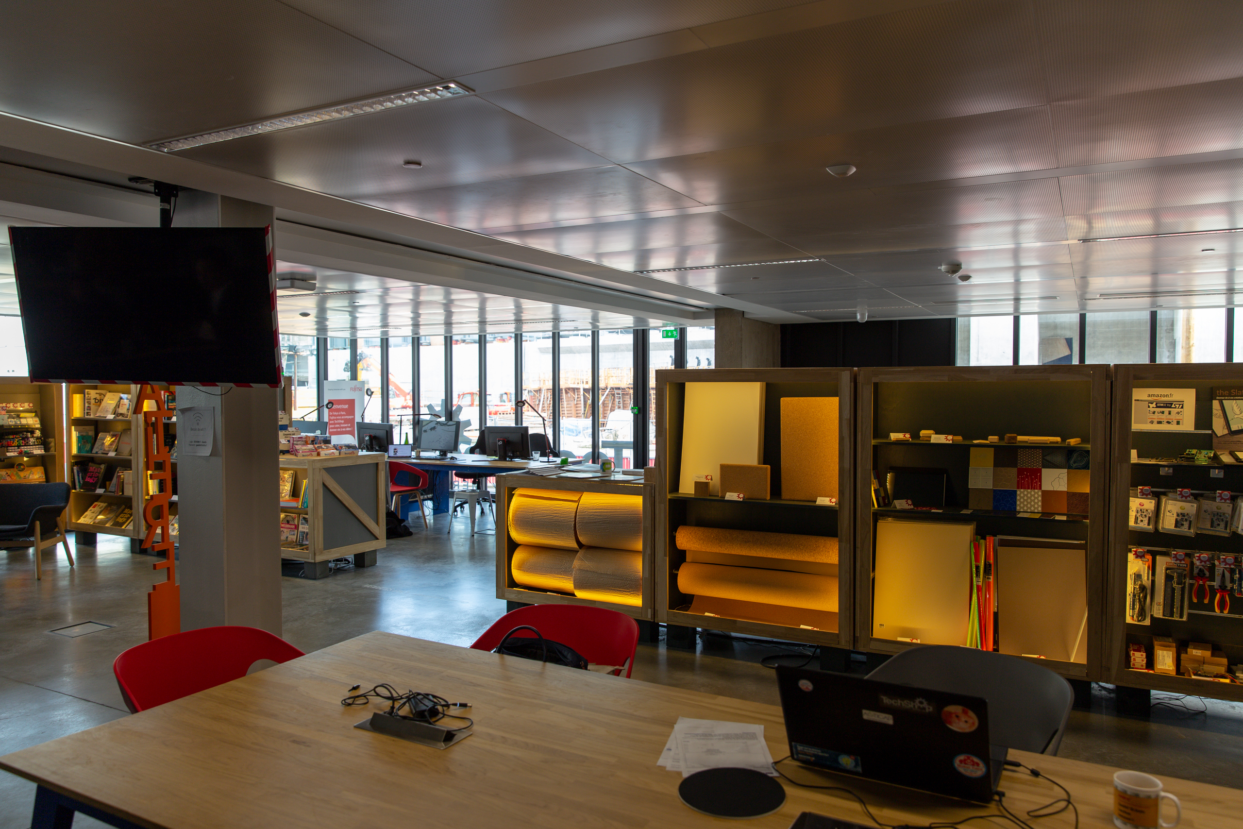 건물 왼편 입구로 들어가면 나오는 테크샵(Techshop)은 여러 개의 방으로 구성되어 있는데, 첫번째 방은 공작실과 자료실을 겸하고 있어서 아기자기하고 산뜻한 인테리어가 돋보였습니다.