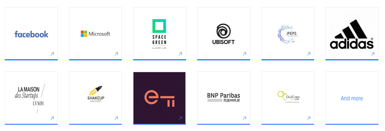 페이스북, 마이크로소프트와 같은 글로벌 IT기업 뿐만 아니라, 유비소프트와 같은 게임회사, 아디다스와 같은 제조기업, BNP 파리바와 같은 금융사 등이 Station F에서 지원 프로그램을 운영하고 있으며,