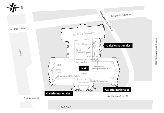 발견의 전당이 있는 그랑 팔레 건물은 지하철 1,13호선 Champs-Élysées -Clemenceau(샹젤리제 끌레망소)역 바로 앞에 있습니다. 하지만 바로 강 건너에 있는 지하철 8,13호선 및 RER C선 Invalides(앵발리드)역에서도 가까운 편입니다. 9호선 Franklin D. Roosevelt(프랭클린 데 후즈벨트)역에서도 가깝습니다.