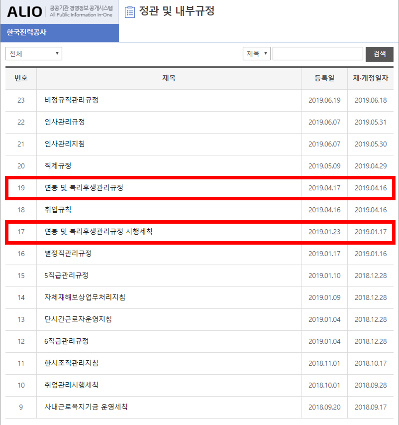 내부규정 항목을 클릭하시면 규정이 여러가지가 뜨는데요, 여기서 '연봉', '급여' 또는 '보수' 라는 키워드로 검색하면 반드시 하나 이상은 보실 수 있습니다. 한전의 경우 '연봉 및 복리후생관리규정', '연봉 및 복리후생관리규정 시행세칙' 두 가지 규정이 있는 것을 보실 수 있습니다.