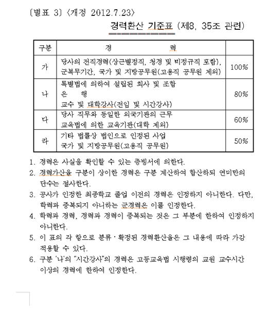 그리고 아래로 내려가서 별표 3을 찾아보면 경력환산 기준표가 있으며, '한전' 소속으로 일한 경력과 군복무기간 등의 경력은 기간 100% 인정, 그 밖의 기업, 기관은 각 기준에 따라 80%, 60%, 50% 인정으로 되어있습니다.
