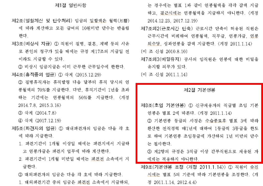 그리고 기관에 따라 계약직, 위촉직 등의 직군에 대해서는 기존 연봉 규정, 급여 규정, 보수 규정 등이 아닌 '계약직 관리 규정', '위촉직 관리 규정' 등의 별도 규정 내에 급여 규정이 있는 경우가 있으므로, 이러한 직무로 입사하거나 입사 준비하시는 분들은 정규직 규정을 보시는 실수가 없도록 해야겠습니다.