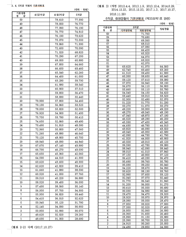 그리고 왼쪽부터 4(가)직, 4(나)직급, 5직급, 그리고 6직급(사무담당원), 6직급(전문담당원), 청원경찰 이렇게 6가지 직군에 대한 기본연봉 테이블을 확인할 수 있습니다.