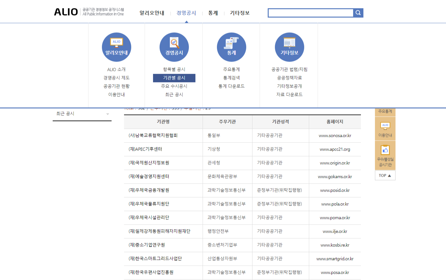 먼저 알리오 사이트에 들어가신 다음, 맨 위 메뉴 중 '경영공시' - '기관별 공시'를 선택한 다음, 본인이 관심있는 기관을 선택합니다. 그러면 위와 같이 공시된 항목이 보이는데요.