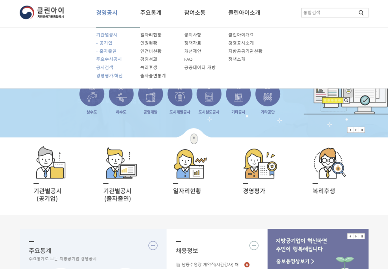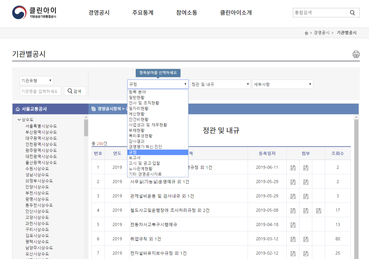 대신 클린아이 사이트를 통해 알리오와 비슷하게 지방공기업과 지자체 출자기관의 경영공시를 확인할 수 있고 내부규정을 통해 연봉이나 급여규정을 확인하실 수 있습니다.