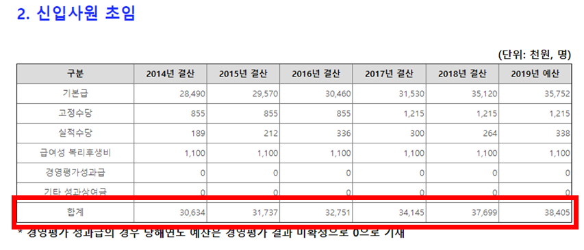 한전 채용공고를 보면 대졸 신입사원은 4(나)직급 5등급으로 채용한다고 되어있는데 위 표를 보면 35,120천원으로 직원 평균보수-신입사원 초임 중 기본급에 해당하는 35,752천원과 유사한 것을 알 수 있지만,