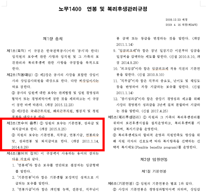 한전의 경우 보수는 '기본연봉', '직무급', '연봉가급', '연봉외수당', '성과연봉', '퇴직급여'로 한다고 되어있습니다.
