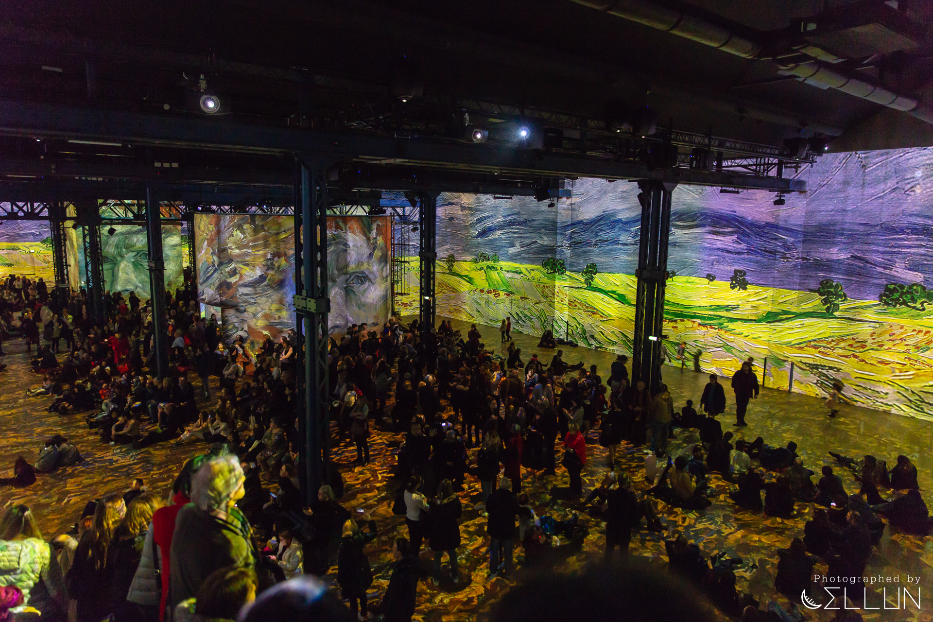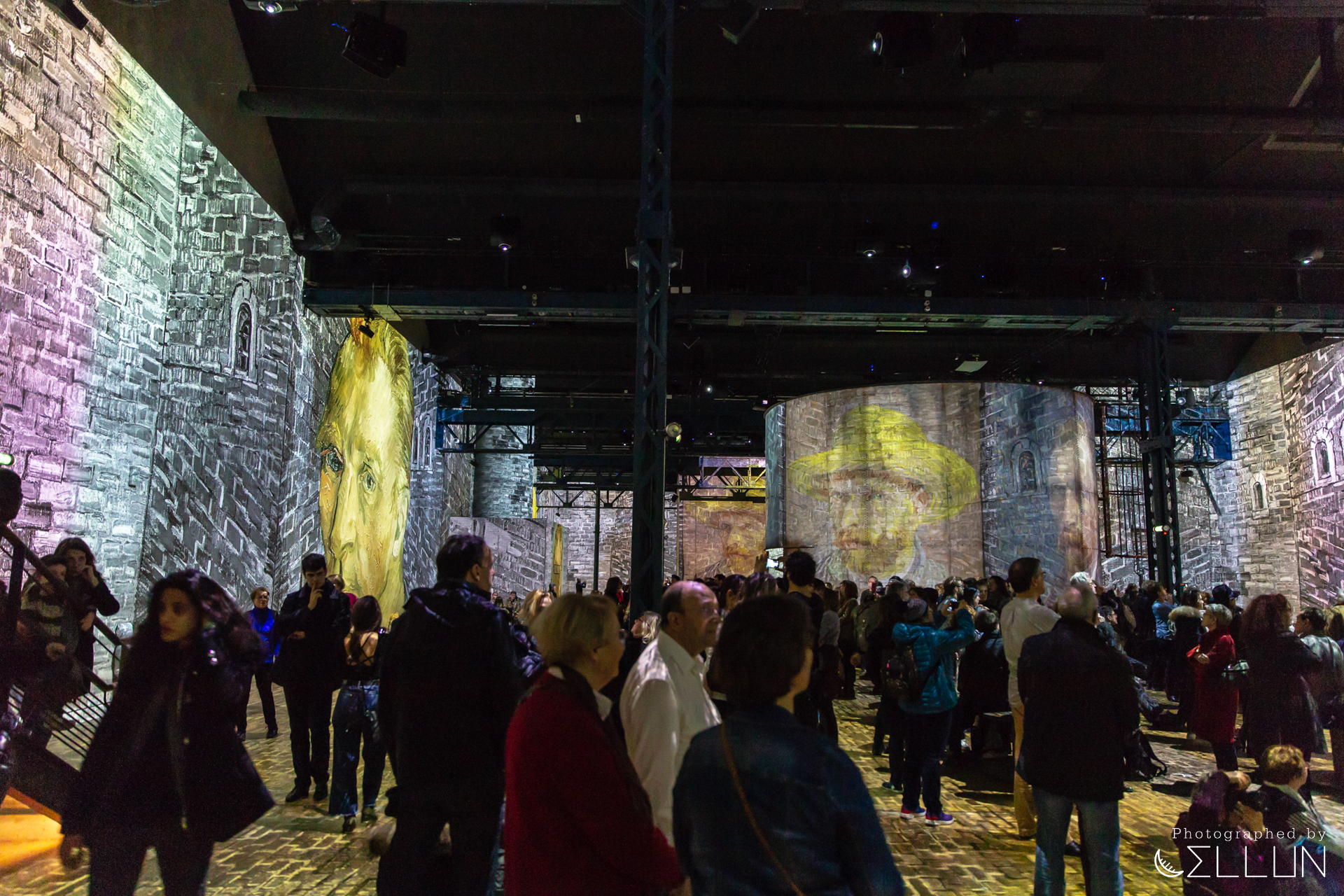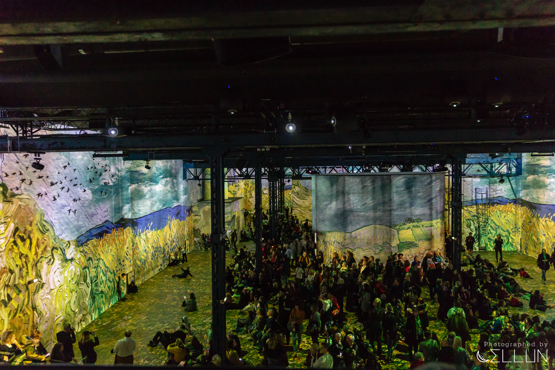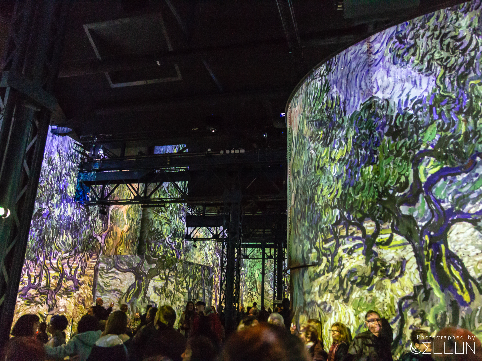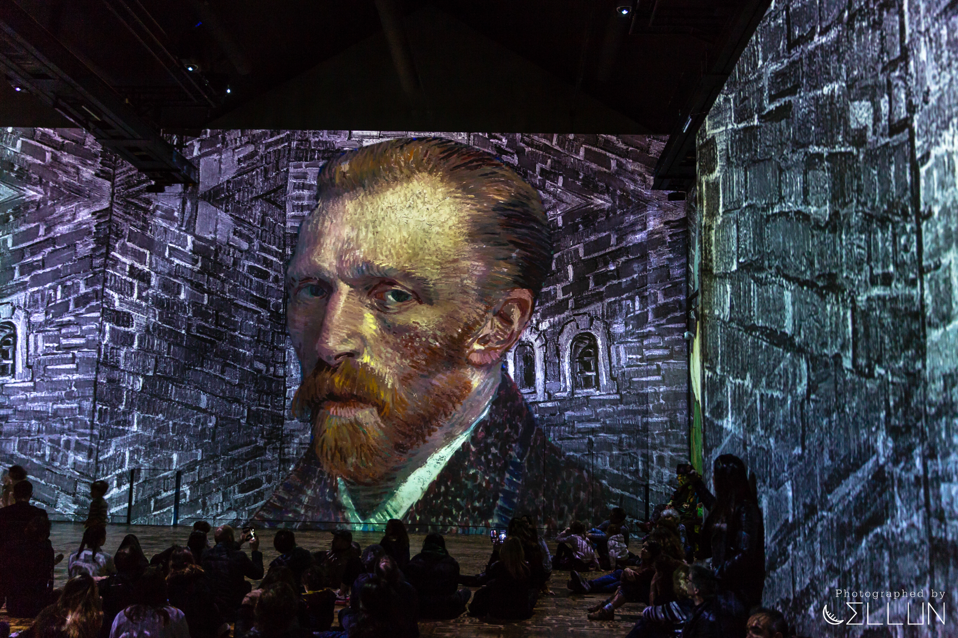 공장으로 사용된 건물답게 내장재가 시멘트, 콘크리트 등 투박한 재질로 되어있고 현재도 원형의 모습을 잘 유지하고 있는 듯 했습니다. 커다란 홀을 하나의 영화관처럼 모든 벽과 바닥에 120대의 프로젝터가 영상을 비추고 있고, 움직이는 그림의 리듬에 맞춰 들리는 음악이 결합되어 훨씬 생동감있고 입체적으로 미술을 감상할 수 있습니다.