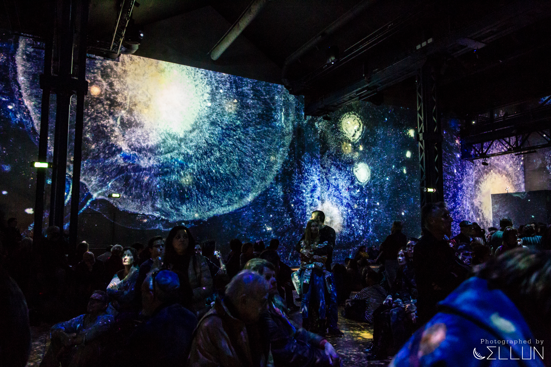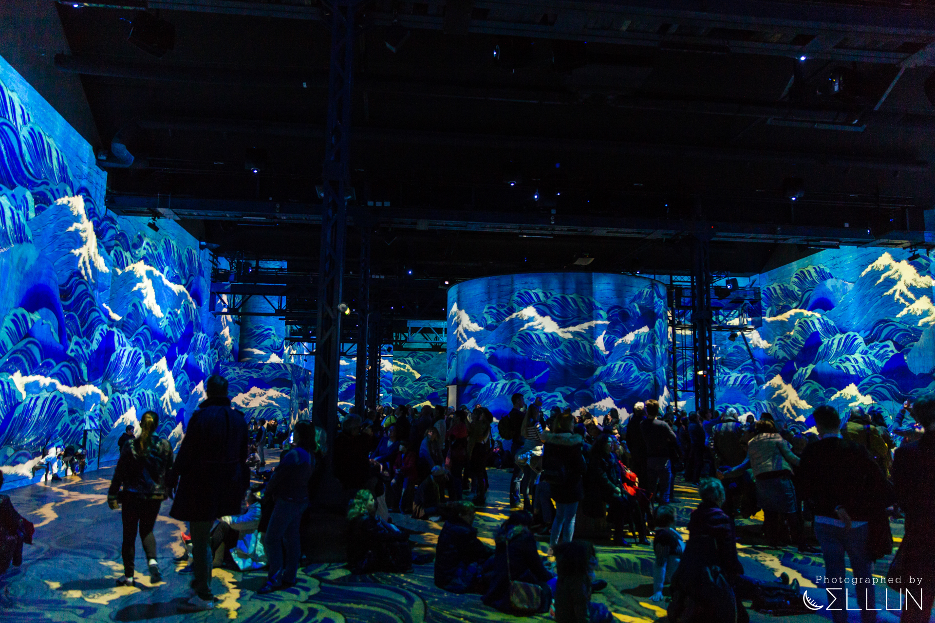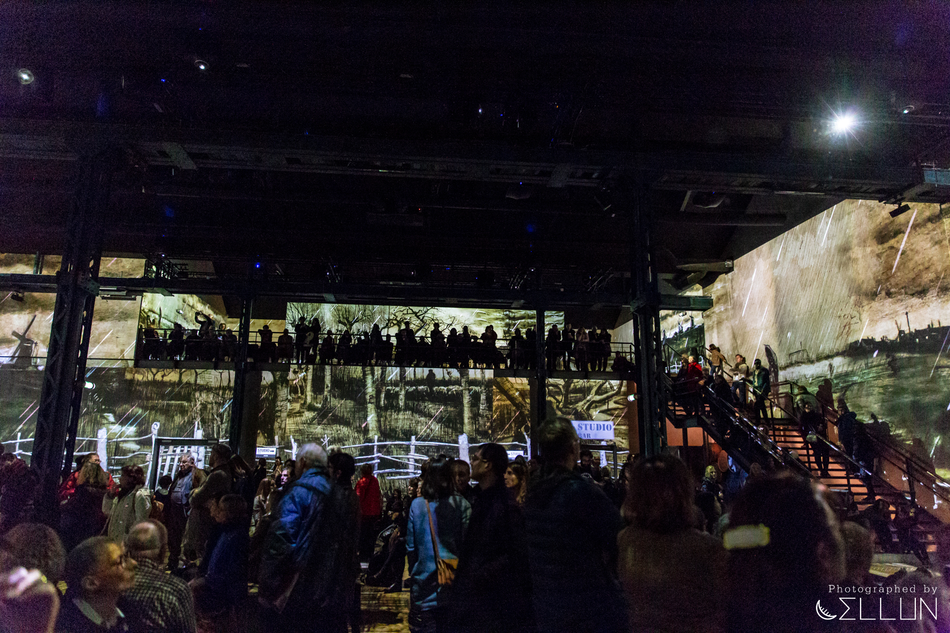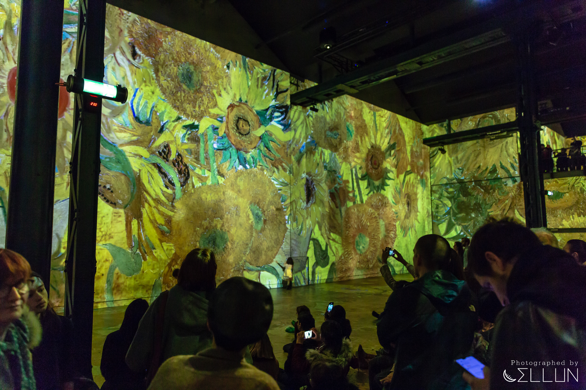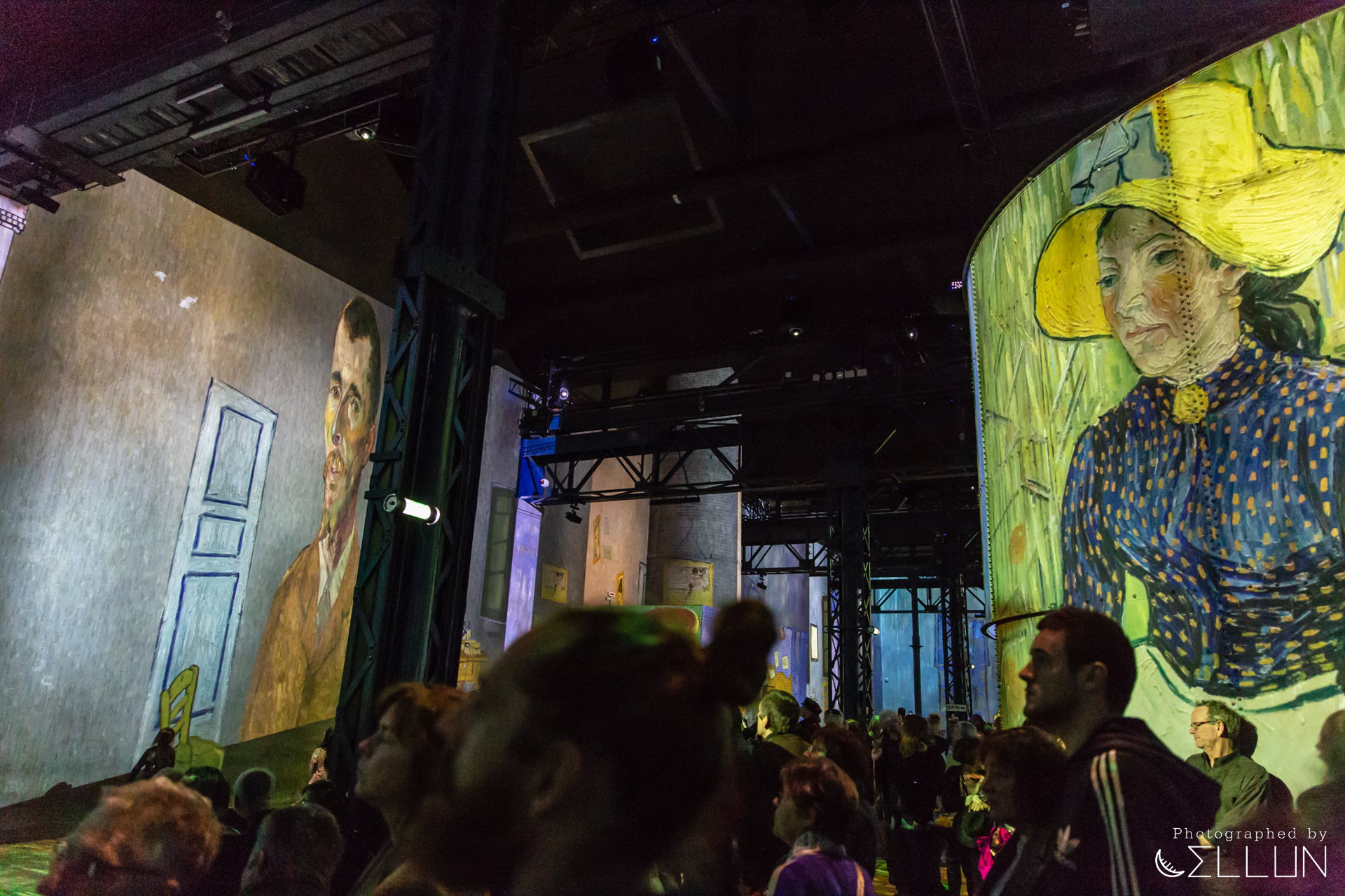 공장으로 사용된 건물답게 내장재가 시멘트, 콘크리트 등 투박한 재질로 되어있고 현재도 원형의 모습을 잘 유지하고 있는 듯 했습니다. 커다란 홀을 하나의 영화관처럼 모든 벽과 바닥에 120대의 프로젝터가 영상을 비추고 있고, 움직이는 그림의 리듬에 맞춰 들리는 음악이 결합되어 훨씬 생동감있고 입체적으로 미술을 감상할 수 있습니다.