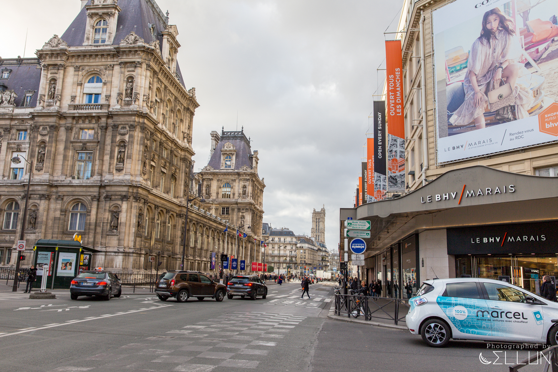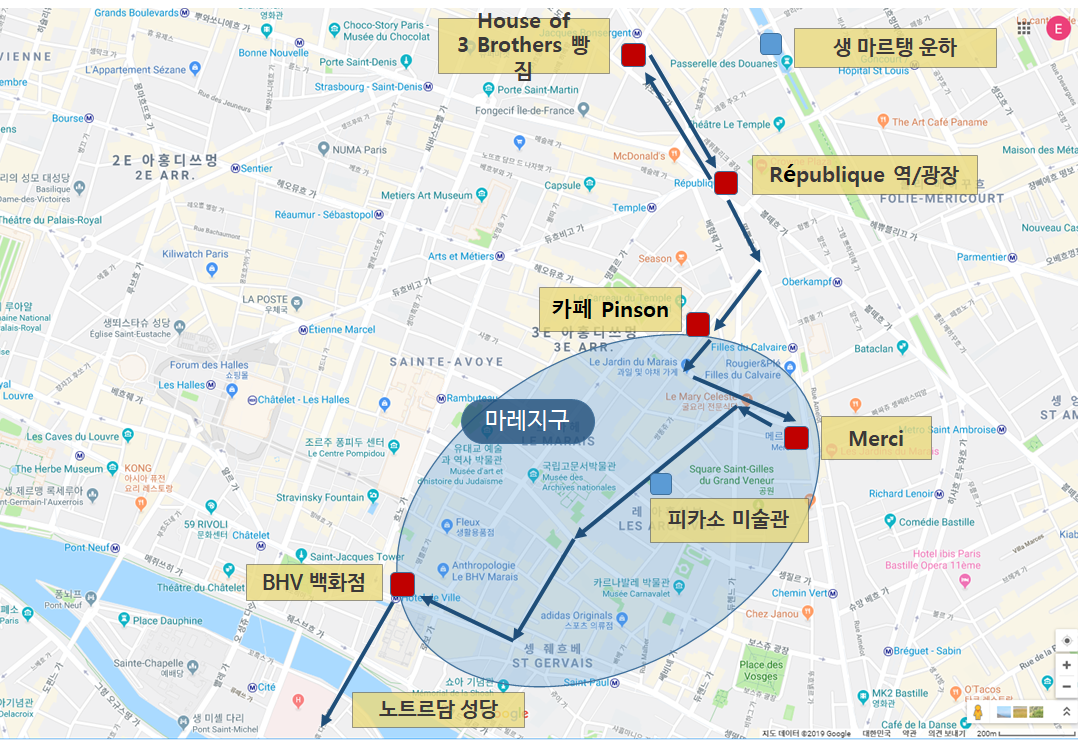 헤퓌블리크 광장부터 Merci를 거쳐 BHV 백화점까지 약 2km 거리가 됩니다.