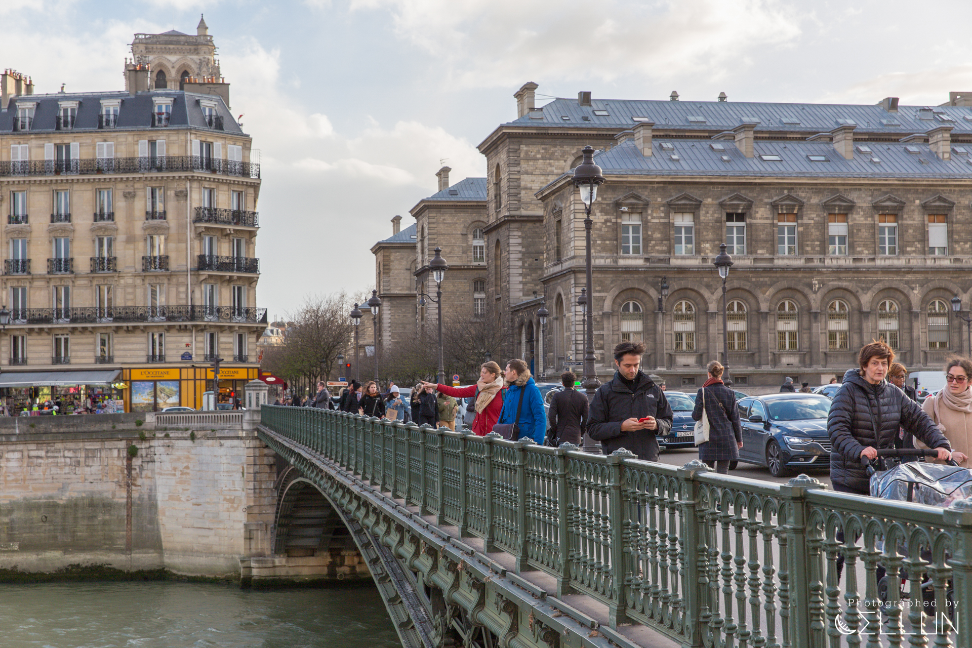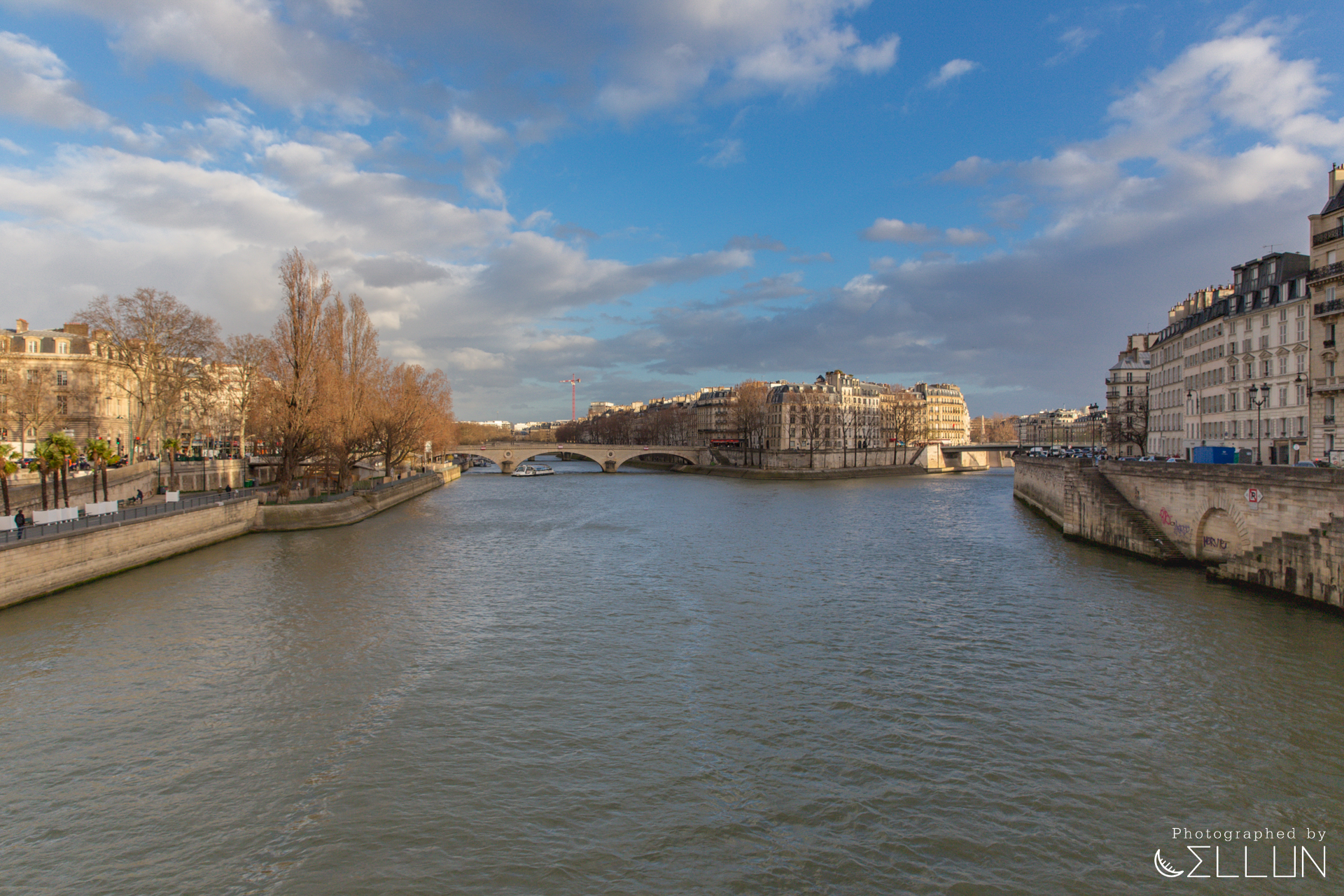 시청에서 노트르담 성당이 있는 시테섬으로 가는 다리. 오른편이 시테섬이고 정면은 시테섬 옆에 있는 좀 더 작고 조용한 동네로 이루어진 섬인 생 루이 섬입니다.