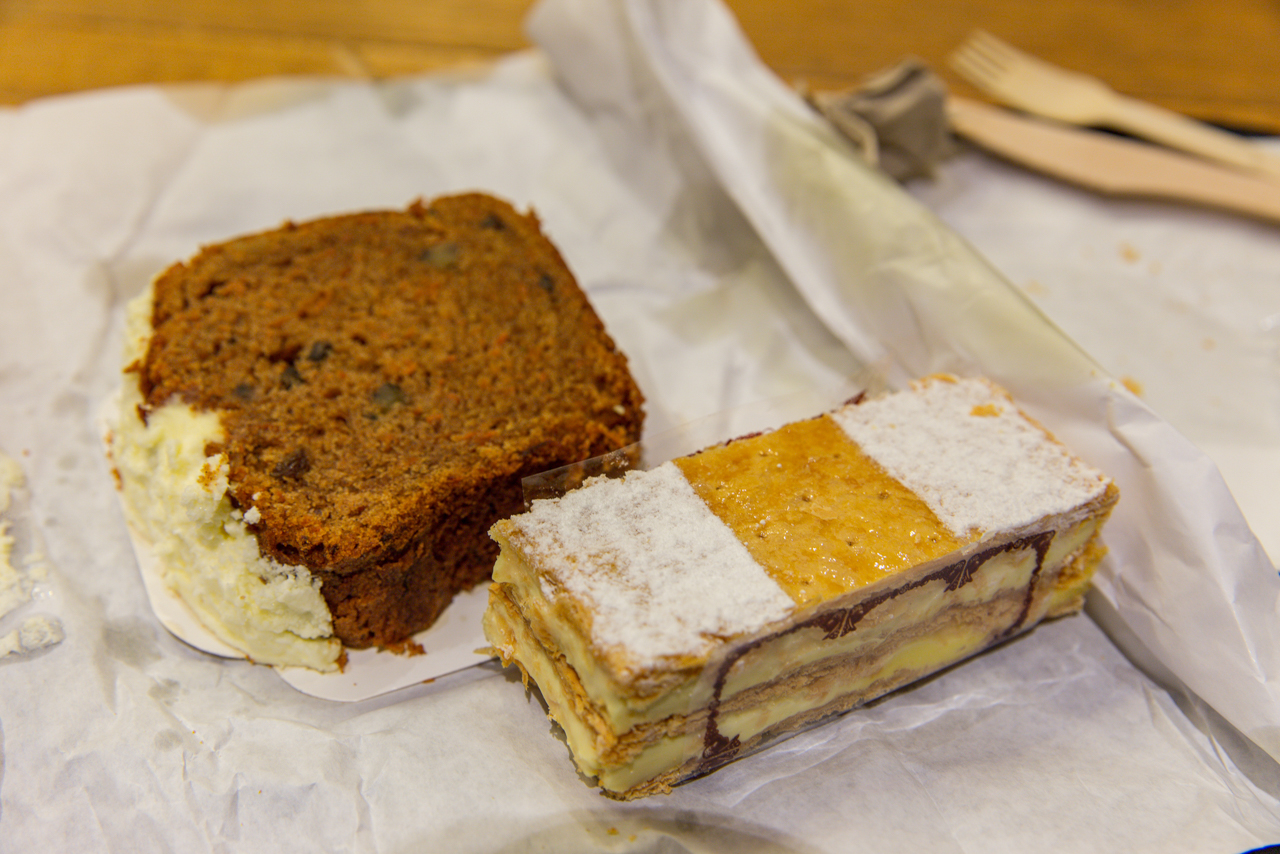 위 사진의 왼쪽 빵은 아까 소개했던 하우스 오브 3 브라더스의 당근 케이크이고, 오른쪽이 마트 베이커리에서 산 밀푀유(2.2유로)입니다.