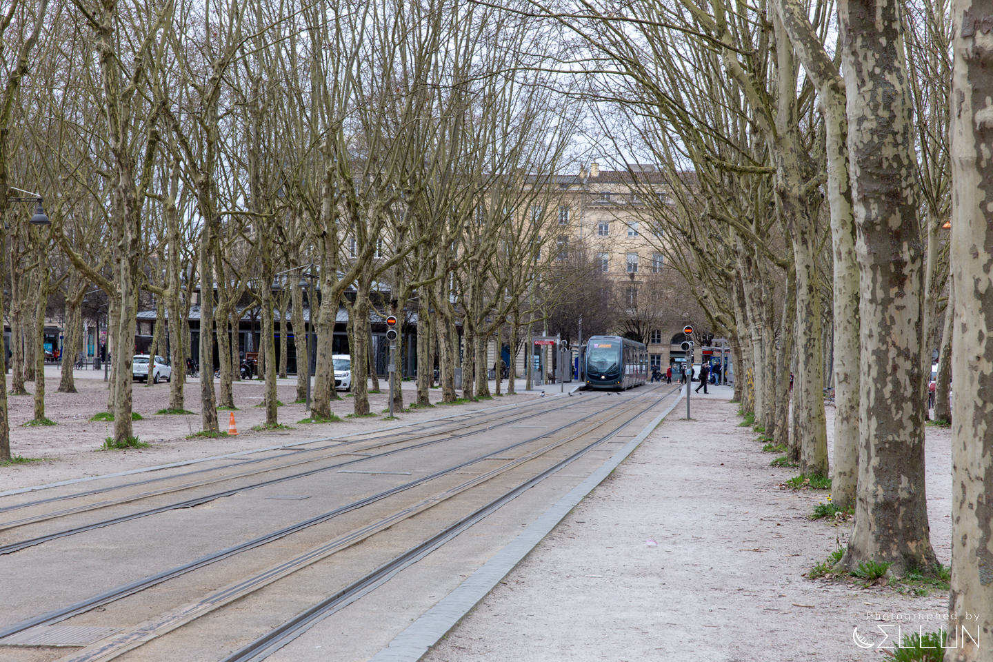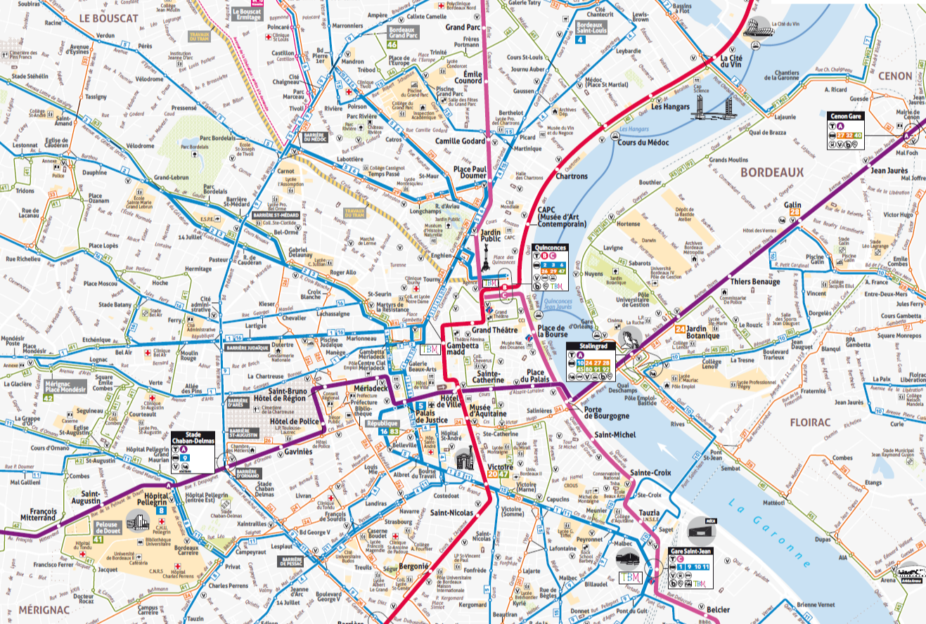 보르도 생 장역과 Bourse 광장, Quinconces 광장은 분홍색 라인인 트램 C선이 다니고 있고,