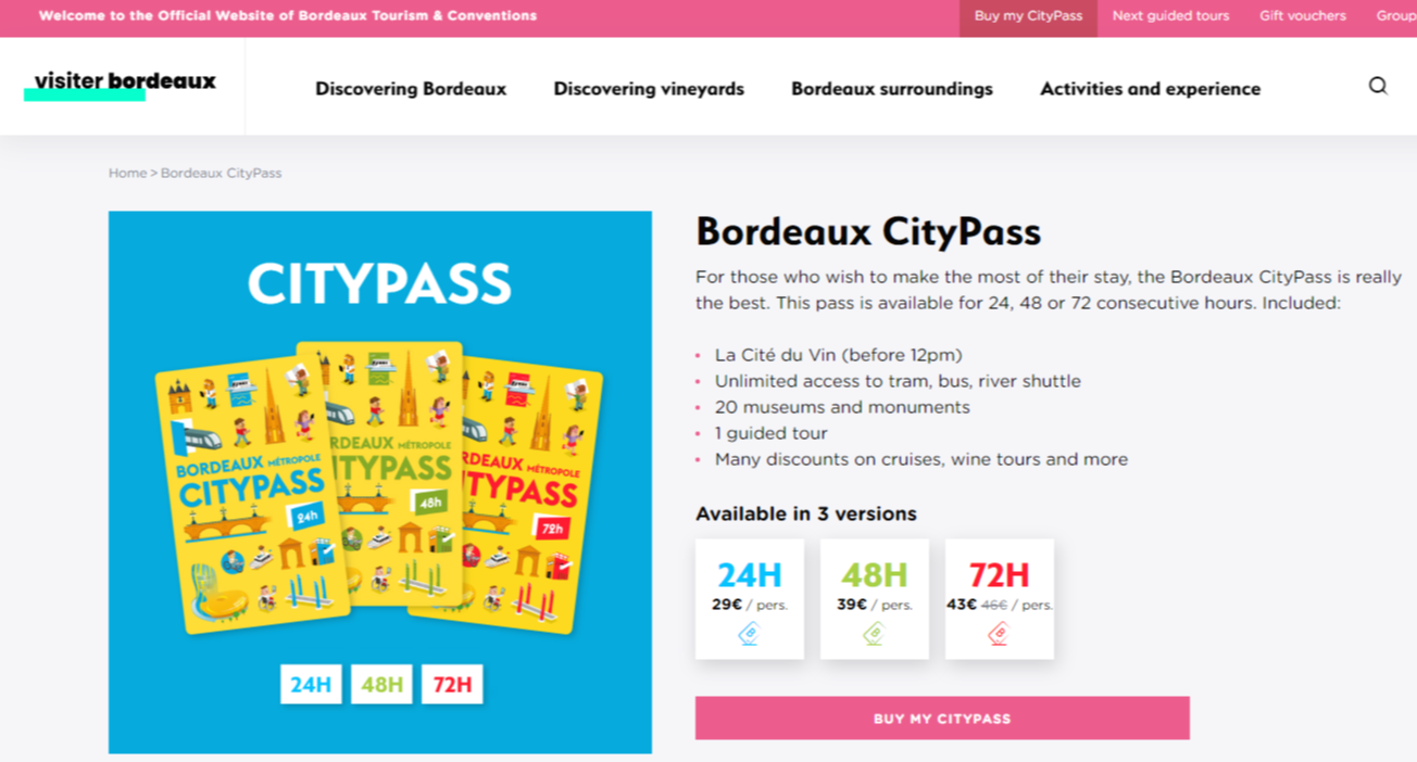보르도도 프랑스 주요 관광도시처럼 일정 기간 할인, 무료 혜택을 제공하는 관광 패스를 판매하고 있습니다.
