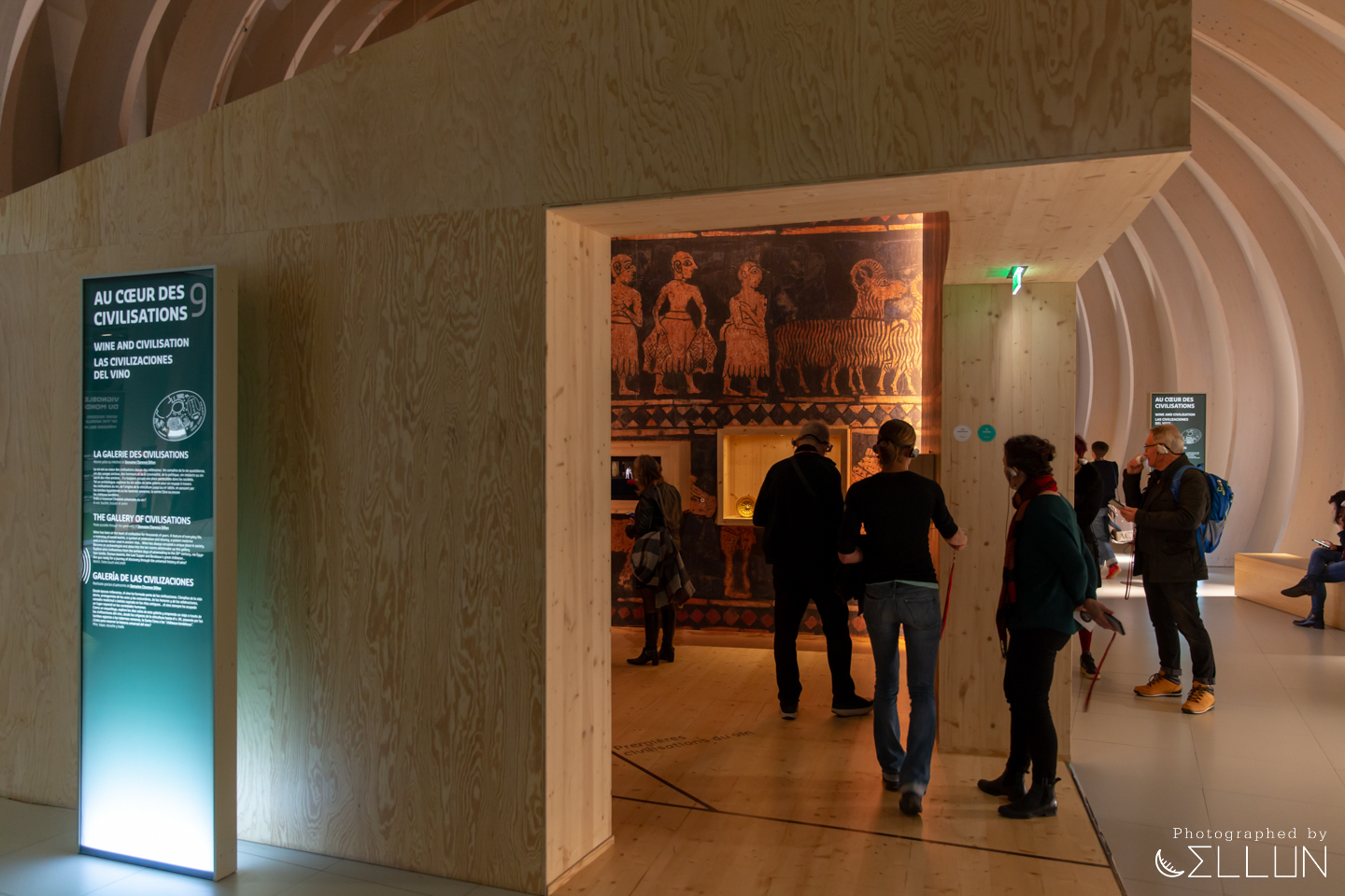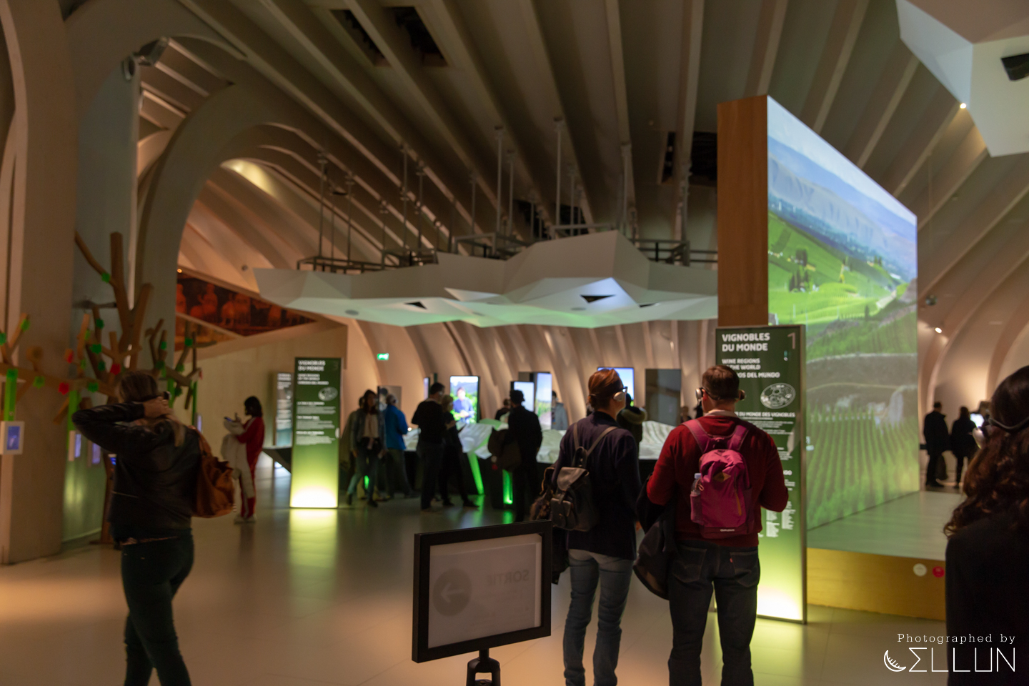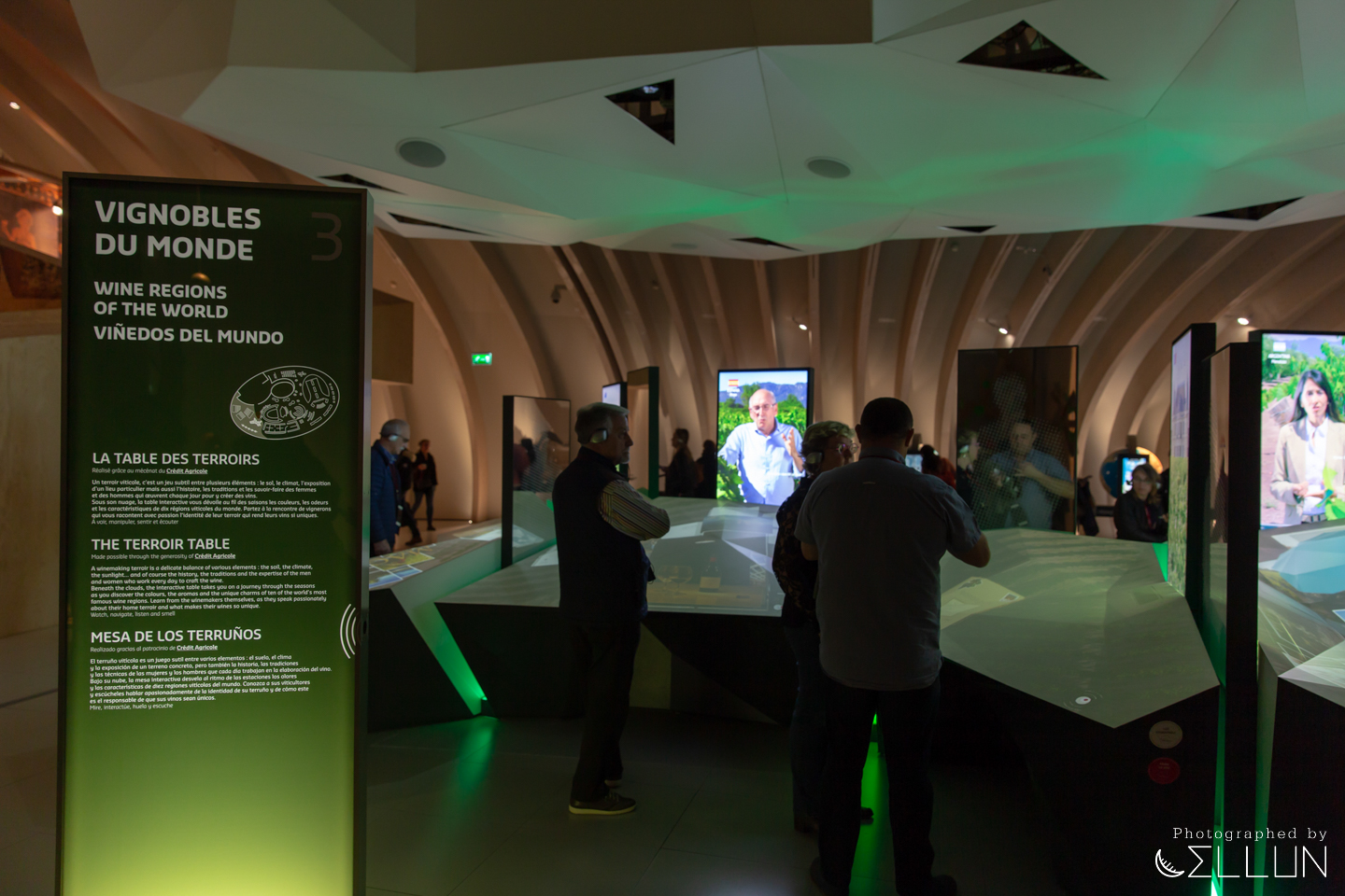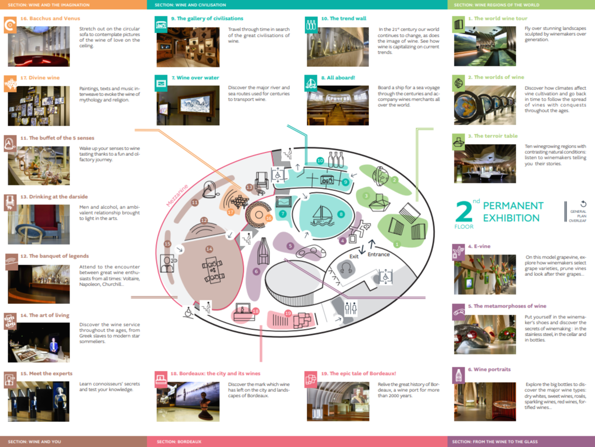 각 섹션은 입구부터 반시계방향으로 세계의 와인 산지(Wine Regions of the World), 와인과 문명(Wine and Civilization), 와인과 상상(Wind and Imagination), 와인과 당신(Wine and You), 보르도(Bordeaux), 와인에서 잔까지(From the Wine to the Glass)로 구성되어 있고,