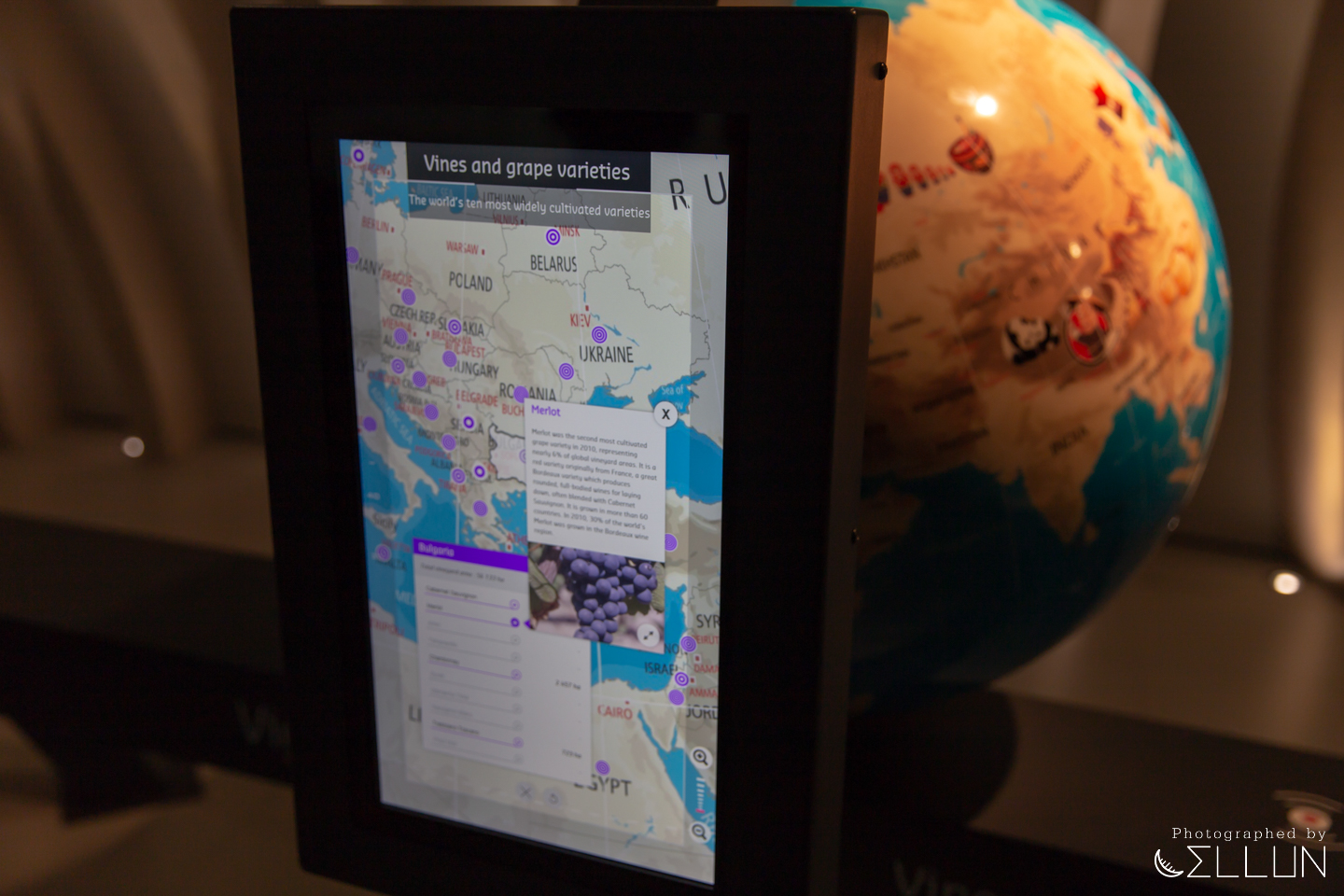 두번째 코너는 와인과 세계로 여러 개의 지구본이 놓여있는 모습이 독특한 곳인데, 각 지구본은 와인에 적합한 지리조건, 국가별 와인 생산,소비량, 와인의 역사 등을 보여주고 있고 지구본을 돌리면 앞에 디스플레이도 함께 지도가 움직이면서 원하는 지역에 대한 내용을 터치하여 볼 수 있는 구조입니다.