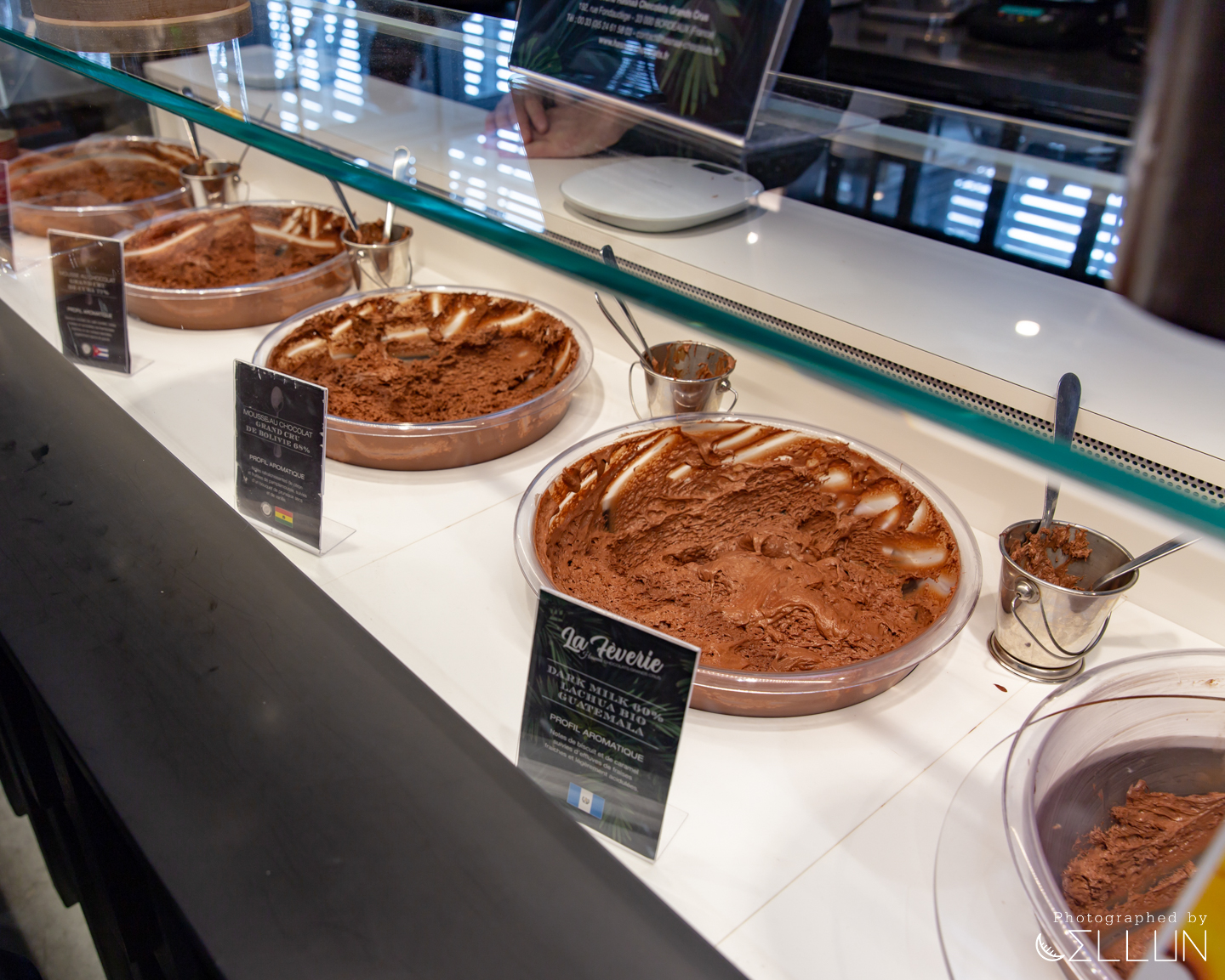 똑같은 초코 아이스크림인 것 같은 생김새인데도 커피처럼 콜롬비아, 과테말라 등 다양한 국가의 카카오로 만든 아이스크림이 대여섯 종류가 진열되어 있어서 프랑스가 확실히 초콜릿 문화가 발달해 있구나 생각이 들었습니다.