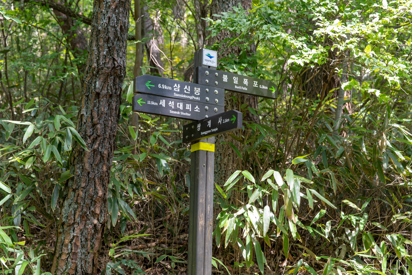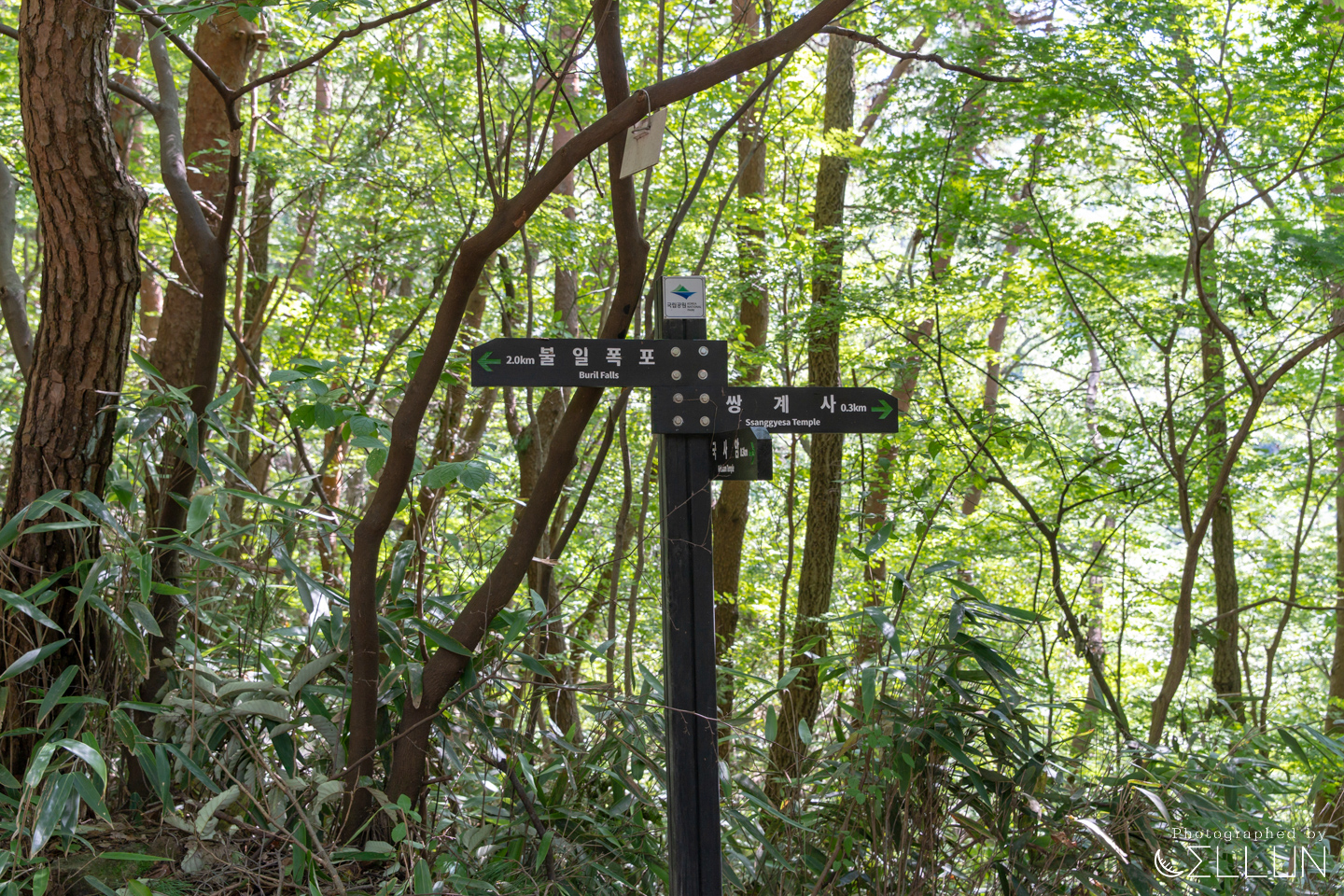 폭포 직전을 제외하고는 완만한 경사의 계곡을 따라 올라가는 길로 난코스는 없고 중간중간 계곡물 지나쳐가서 더운 몸을 식혀가기 용이했습니다.