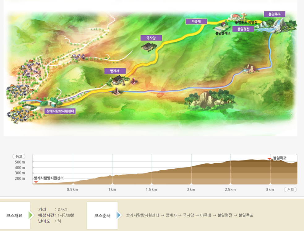 쌍계사에서 불일폭포까지는 약 2,400m로 올라가는 데 1시간 반, 왕복으로는 2시간반에서 3시간 정도 소요됩니다.