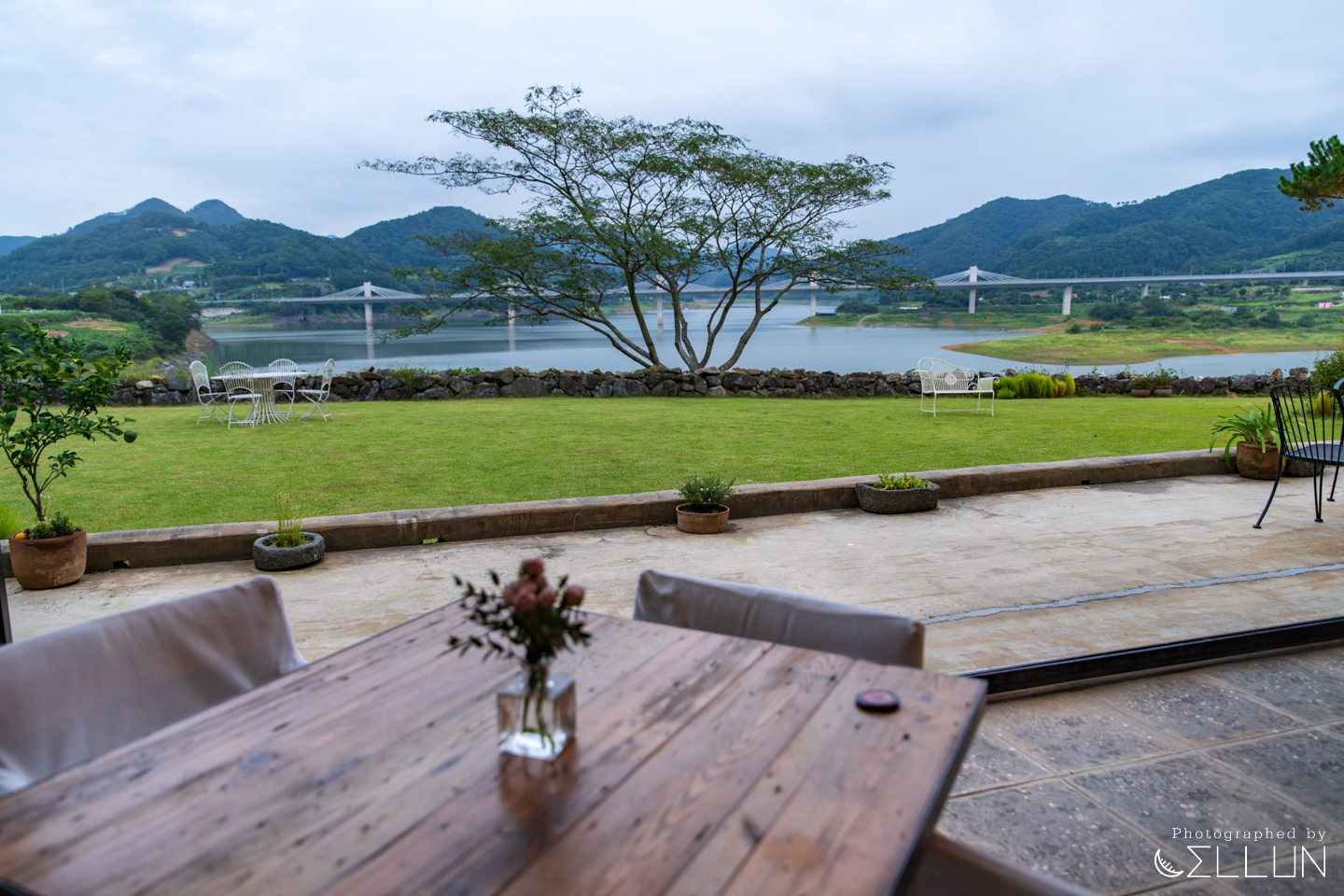호수 바로 앞이 정원으로 꾸며져 있는데 정면으로 옥정호를 건너는 운암대교를 바라보는 위치에 있어서