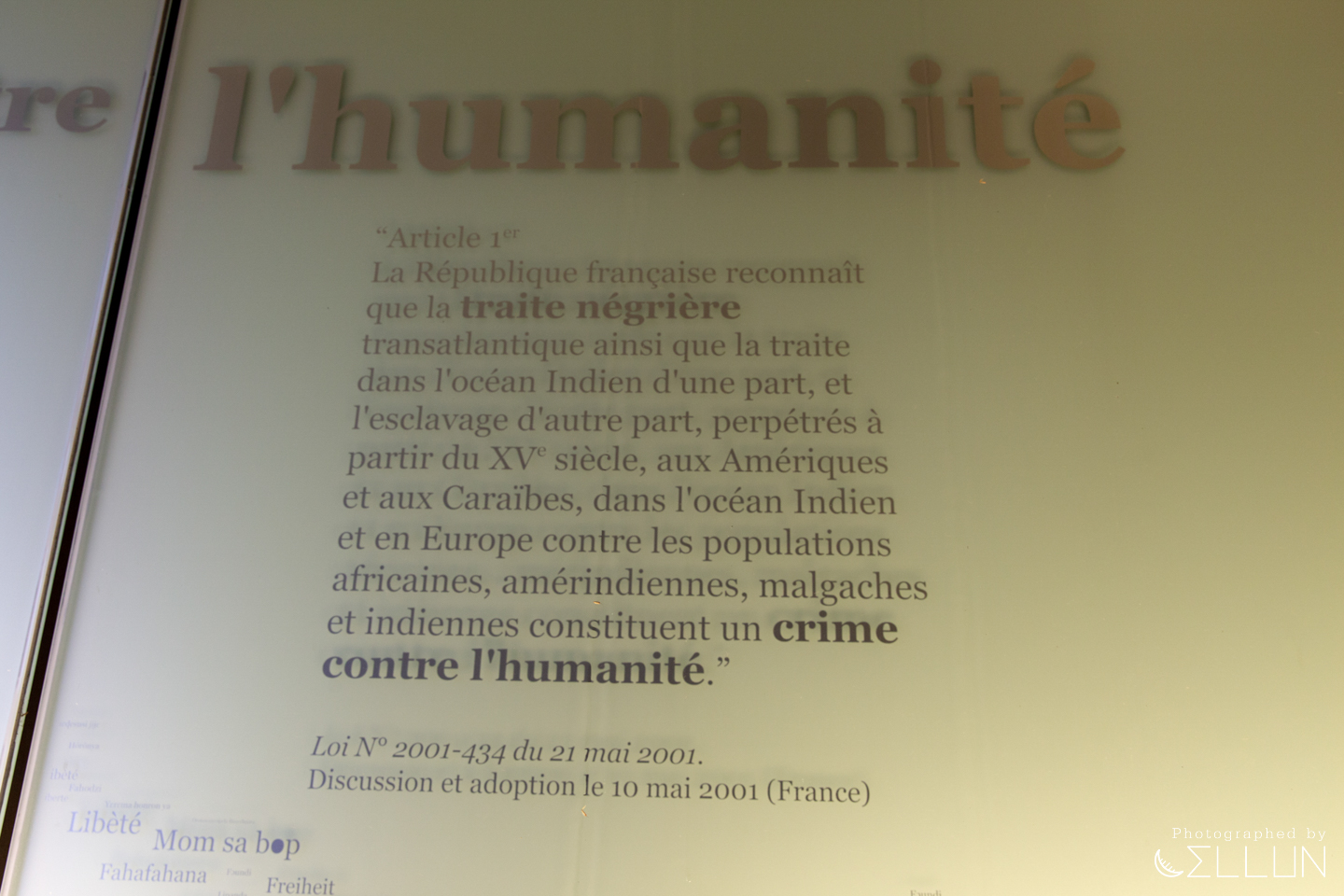벽에는 프랑스 및 각국의 노예 해방 및 인종차별반대, 평등사상과 관련된 법, 선언문 등이 적혀있습니다.