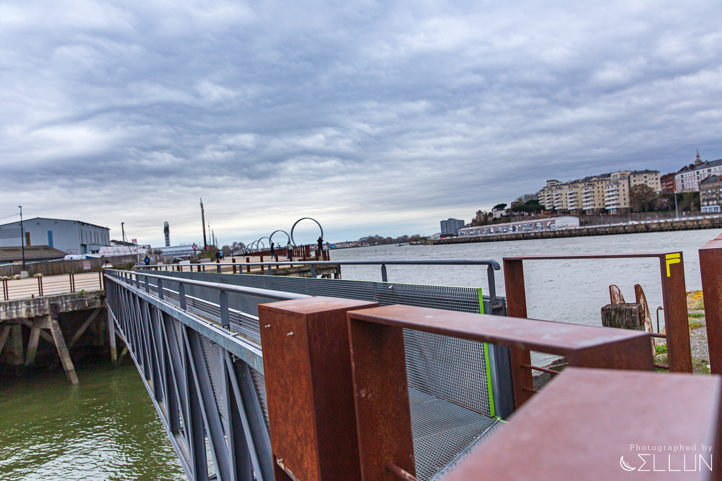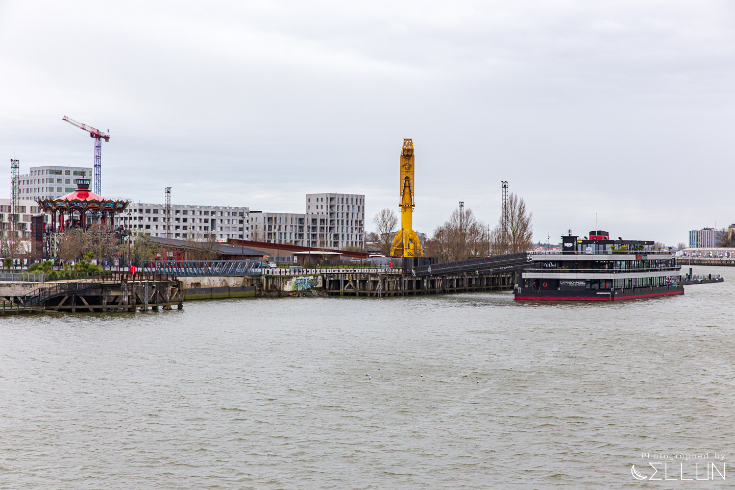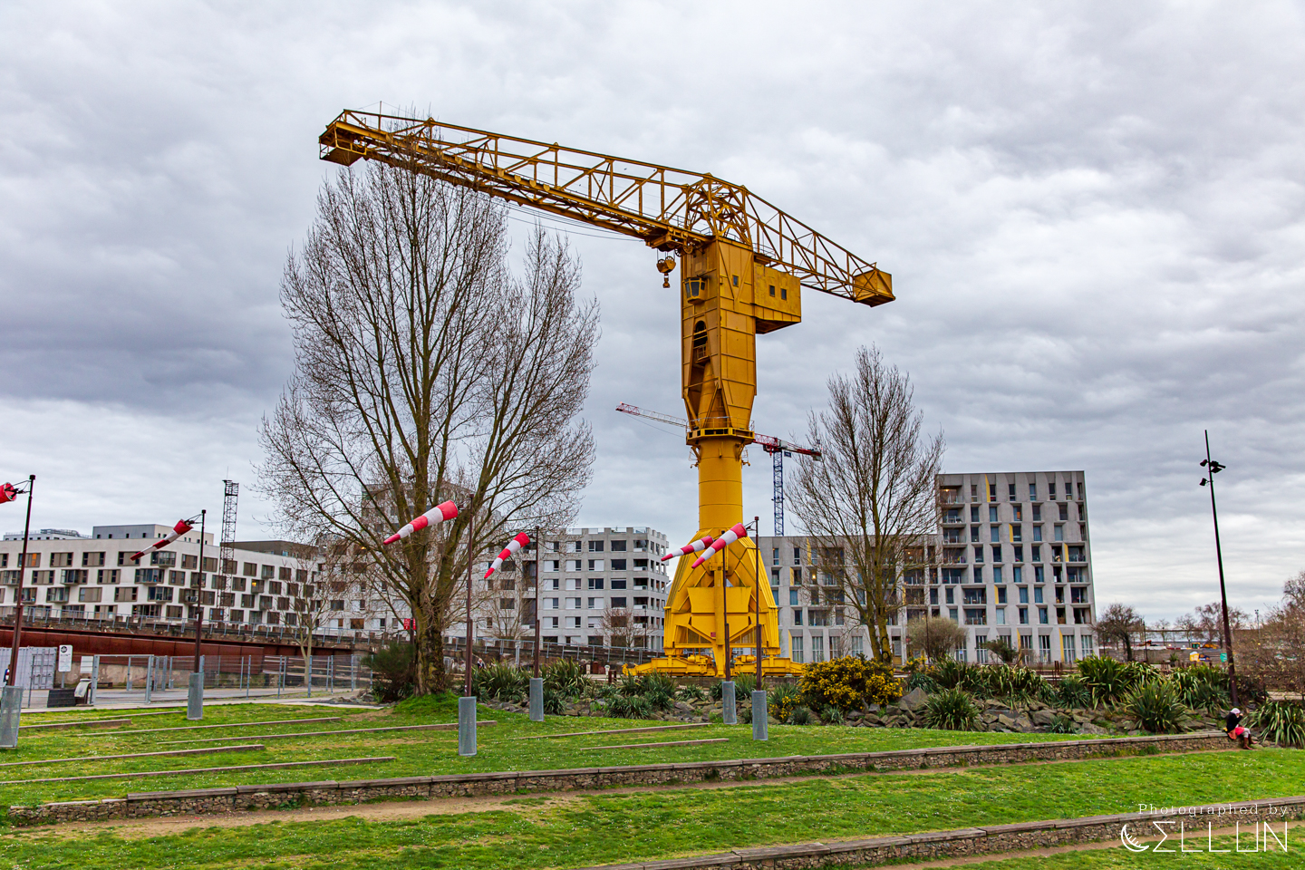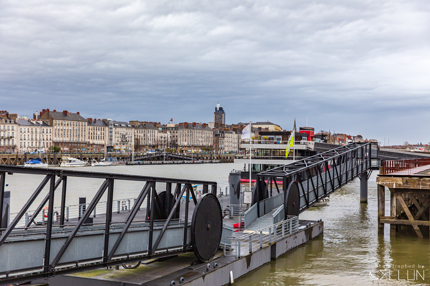 회전목마를 지나 강가에 이르면 거대한 노란색 크레인(Grue Titan Jaune)과, 녹슨 철로 된 프레임이 남아있는 조선소의 흔적이 남아있는 산책로가 보입니다. 위로 급하게 경사진 옛날에 사용된 도개교의 모습도 남아있네요.