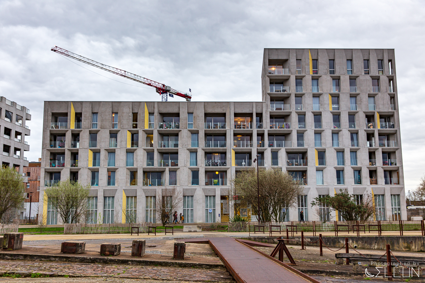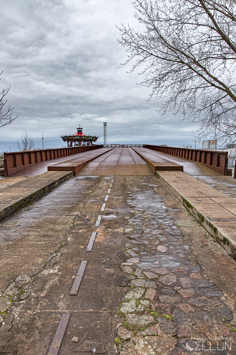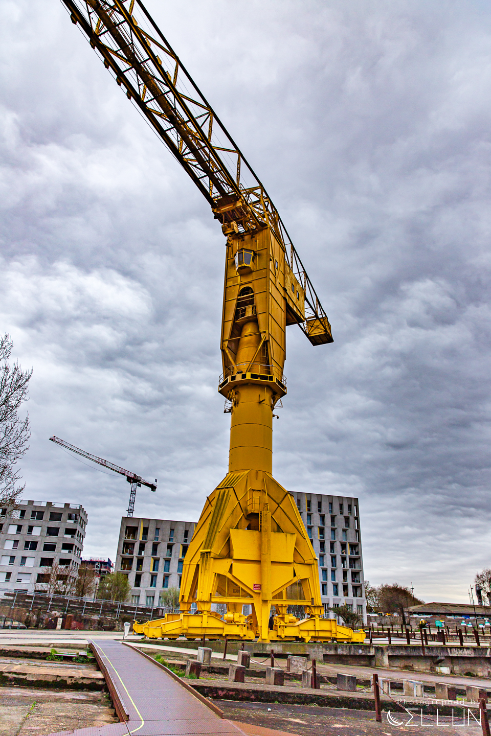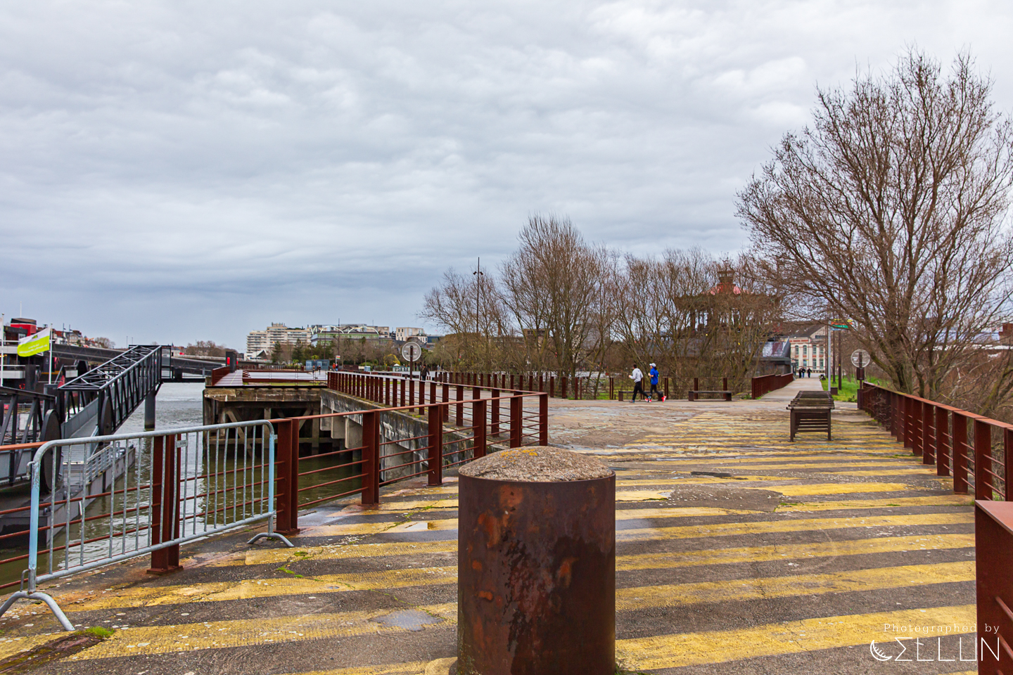 회전목마를 지나 강가에 이르면 거대한 노란색 크레인(Grue Titan Jaune)과, 녹슨 철로 된 프레임이 남아있는 조선소의 흔적이 남아있는 산책로가 보입니다. 위로 급하게 경사진 옛날에 사용된 도개교의 모습도 남아있네요.