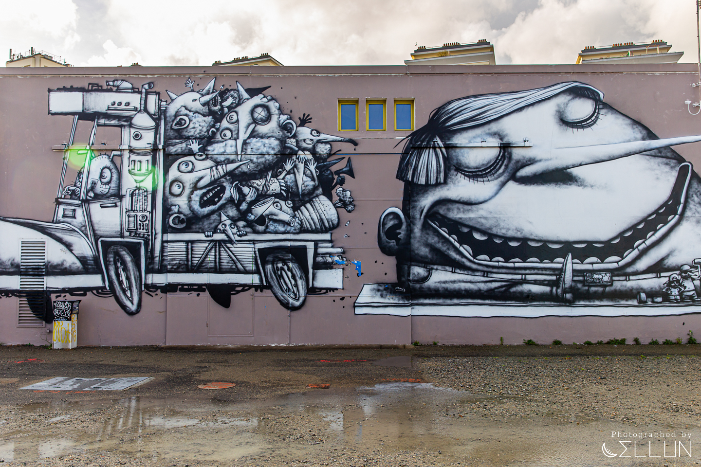 그리고 좀 더 가다보면 커다란 창고건물이 보이는데, 여기에는 Trafic이라고 하는 벽화가 있습니다. 벽화가 있는 이쪽은 제대로된 산책로가 아니라 관광으로 갈 만한 위치는 아니라 일부러 여기까지 오실 필요는 없을 것 같고, 아까 위에서 갔던 Les Anneaux(고리들) 위치에서 보셔도 될 것 같습니다.