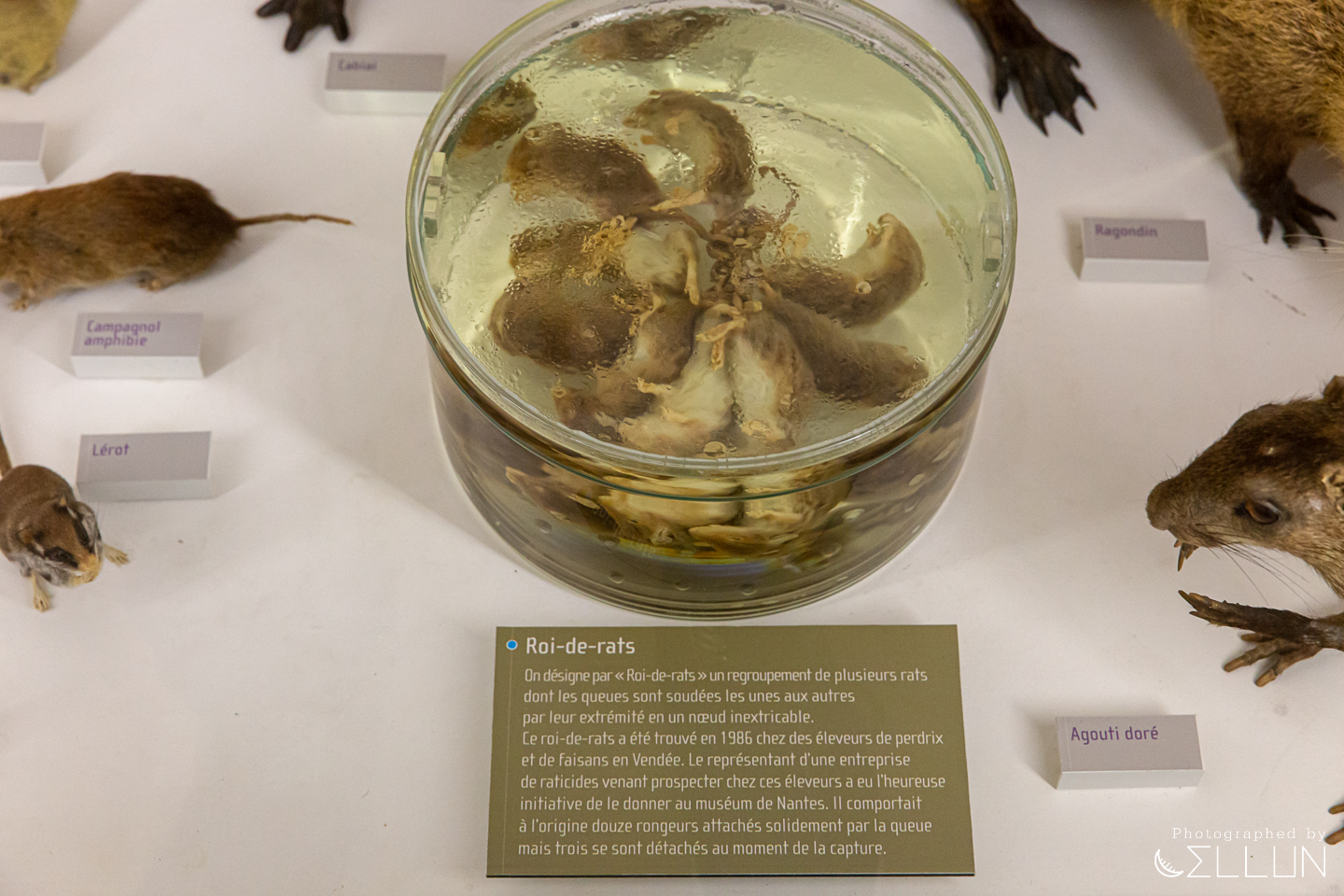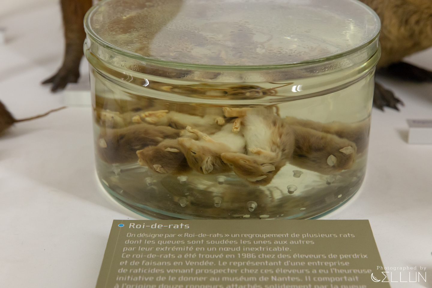 어쨌든 유럽에는 랫 킹 설화가 있어서 낭트를 포함해서 스트라스부르, 함부르크, 슈튜트가르트, 함부르크의 박물관에 이 랫 킹이 남아있는데, 낭트 자연사 박물관의 랫 킹은 1986년에 '발견'되었다고 합니다. 아홉 마리가 둥글게 모여있는 듯한 모양새인데, 30년의 세월이 지났지만 여전히 잠들어있는 모습처럼 보입니다.