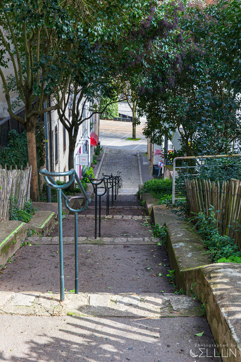 Tour Bretagne를 뒤로 하고 다시금 골목으로 들어서는데, 비교적 현대적인 도로변과 다르게 뒷골목은 전혀 다른 달동네 비슷한 분위기를 뿜고 있었습니다. 고층 건물 뒤쪽에 이런 숨겨진 골목이 있다니, 숨은 보석을 찾은 것 같은 보람이 느껴집니다. 그리고 코스를 안내하는 선도 재미나게 바닥과 벽을 넘나들며 입체적으로 선을 그어놓았네요.