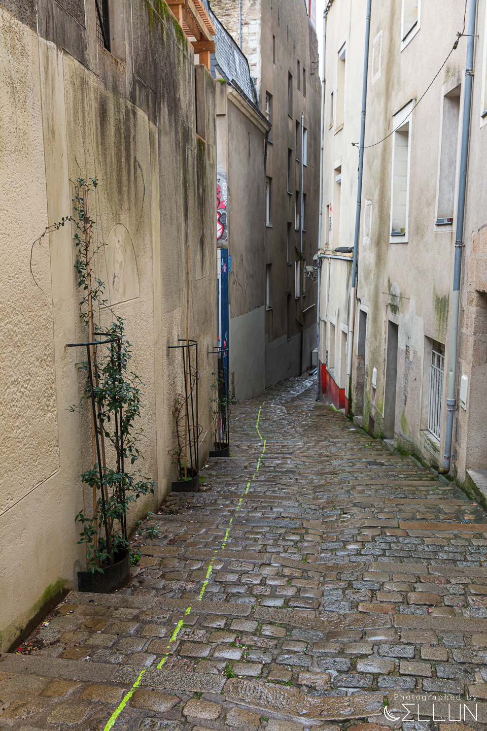 이렇게 낭트 도보 코스는 대개 바닥을 따라 선이 그어져있지만 어떤 곳들은 저런 식으로 기둥이나 벽에 칠해져 있는 경우가 있습니다. 조금 헷갈릴수도 있는데, 저렇게 다양한 방법으로 코스를 표시해놓은 게 깨알같은 센스라 느껴져서 재미있었습니다.