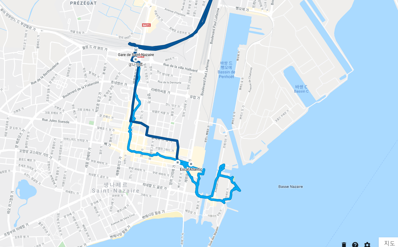 구글 지도에 기록된 루트를 보면 하늘색 루트가 생 나제르역에서 잠수함 기지와 항만을 걸은 경로입니다.