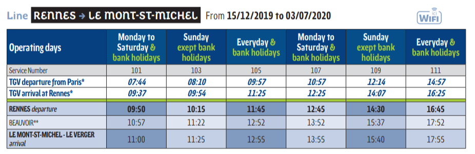 위 버스 안내 사이트에 안내된 렌↔몽생미셸 간 버스노선 시간표를 캡처했는데,