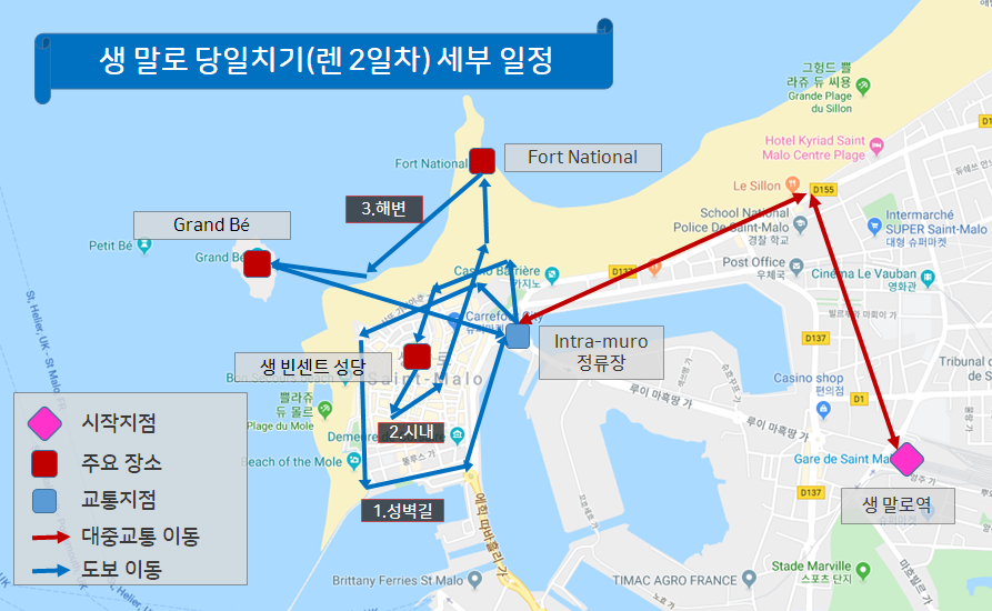 생 말로의 관광 핵심인 구시가지, 성벽도시(La Ville Intra-muros)는 생 말로 역에서 1.5km 정도 떨어져 있어서 걸어서 20분 정도 걸리고, 또는 역 앞 버스정류장에서 1,2,3번 버스 중 하나를 타면 5분 정도 걸려 구시가지 입구에 도착할 수 있습니다.
