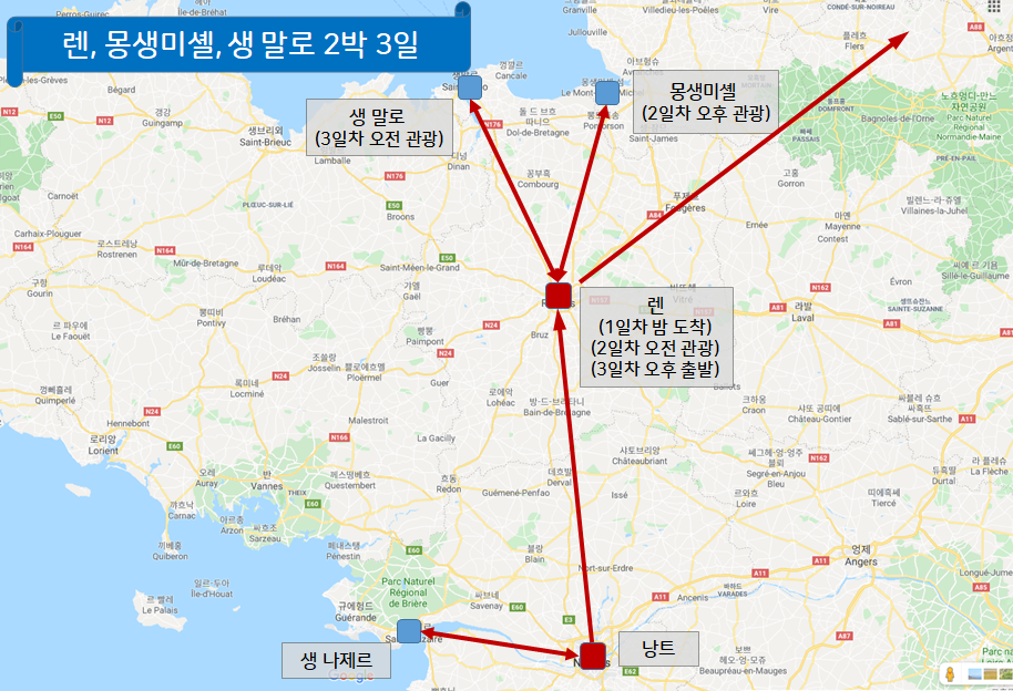 몽생미셸 뿐만 아니라 프랑스 브르타뉴(브리타니) 지역 방문계획이 있으시다면 렌, 몽생미셸, 생 말로를 묶어서 2박 3일 일정으로 여행해보시면 좋을 듯 합니다.