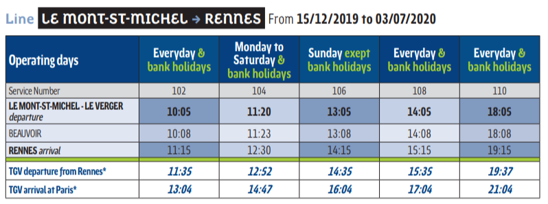 몽생미셸에서 렌으로 가는 버스도 마찬가지로 10:05, 11:20(일요일은 13:05), 14:04, 18:05 4회 운행합니다.