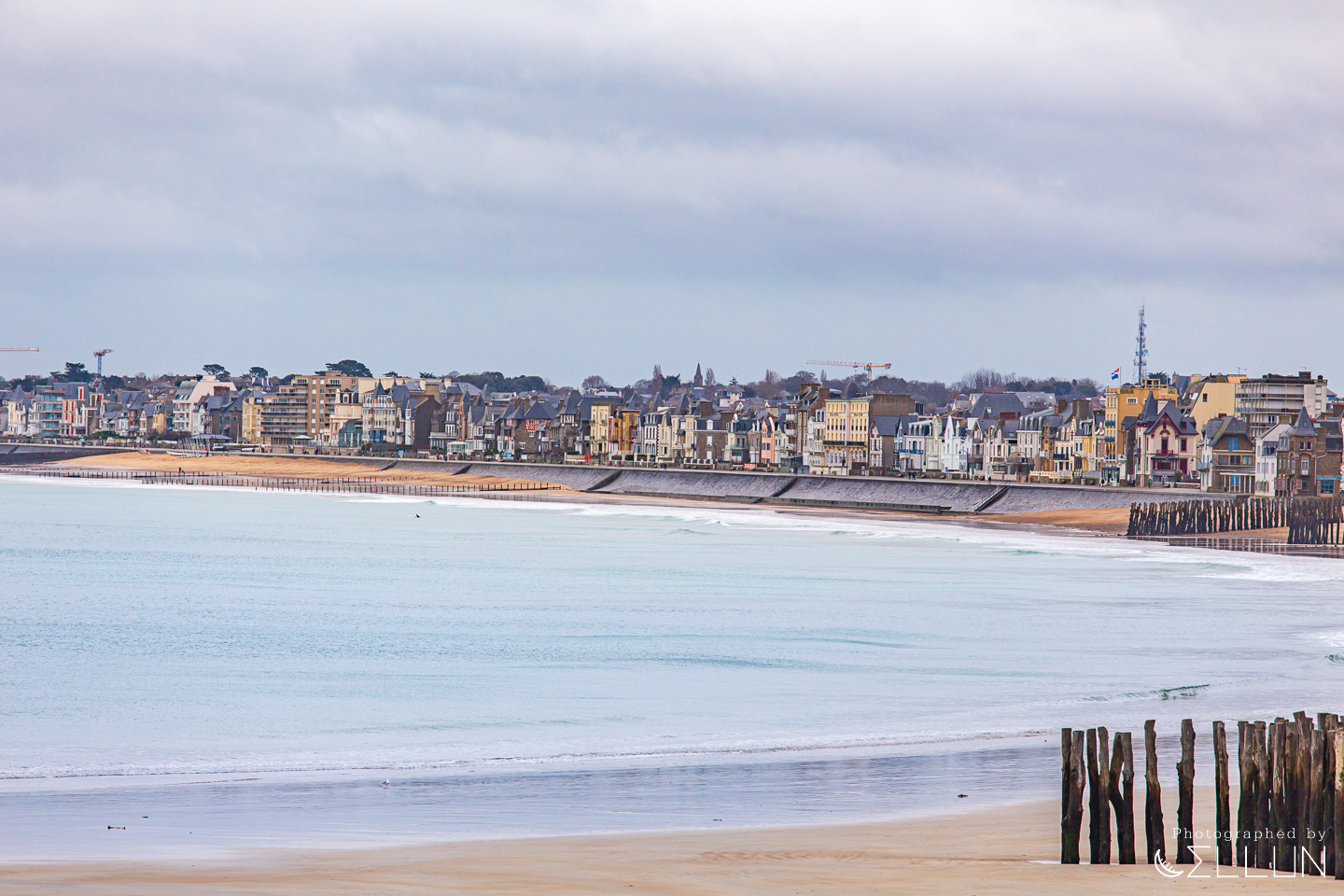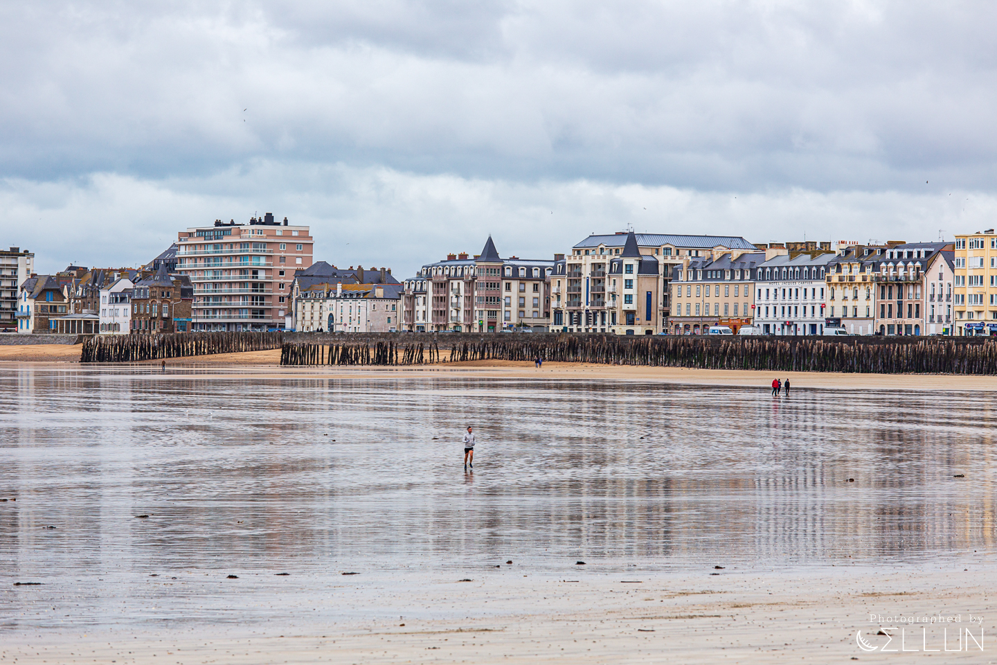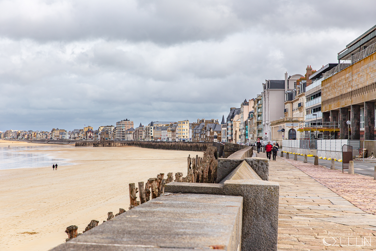 생 말로 시내쪽 해변가. 물이 대부분 빠져서 백사장 면적이 엄청나게 넓어졌습니다. 시용 해변(Plage du Sillon)이라고 하는 이 해변은 1,671m 길이로, 나무기둥을 빽빽하게 세워놓은 모습이 인상적인데 나무기둥의 색깔을 보아하니 만조시기에는 거의 해안도로 바로 앞까지 물이 차나봅니다. 파도가 시내까지 들어가지 못하도록 방어막을 해주는 역할을 하고 있네요.