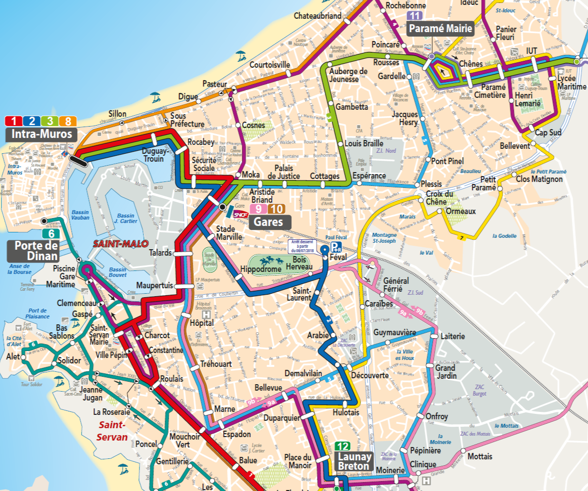 생 말로의 관광 핵심인 구시가지, 성벽도시(Intra-muros)는 생 말로 역에서 1.5km 정도 떨어져 있어서 20~25분 정도 걸어서 갈 수 있고, 또는 역 앞 버스정류장(Gares)에서 1,2,3번 버스 중 하나를 타면 5분 정도 걸려서 입구에 도착할 수 있습니다.
