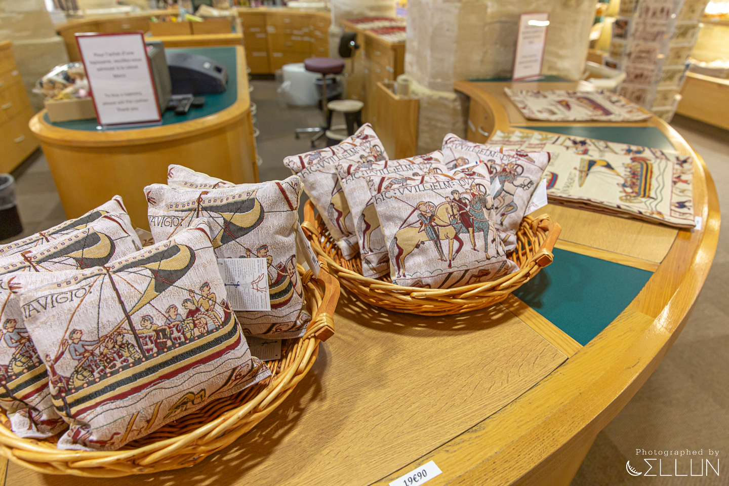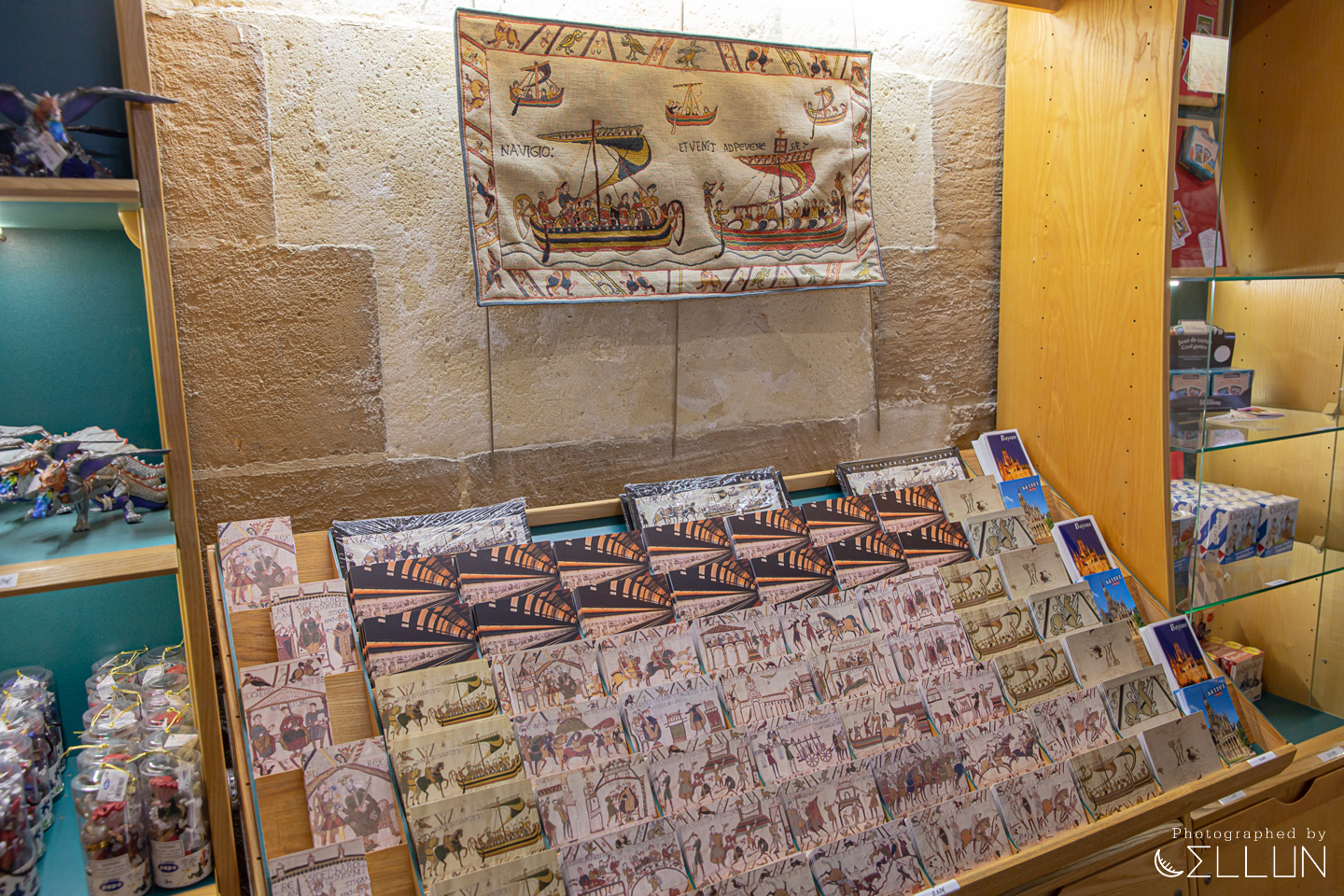 전시된 상품들도 대부분 바이외 태피스트리를 활용한 엽서, 필기구, 베개, 에코백이나 바이외, 중세시대를 주제로 한 것들입니다. 기념으로 바이외 태피스트리 전시관 내부와 일부가 인쇄된 엽서 두 장을 사왔습니다~
