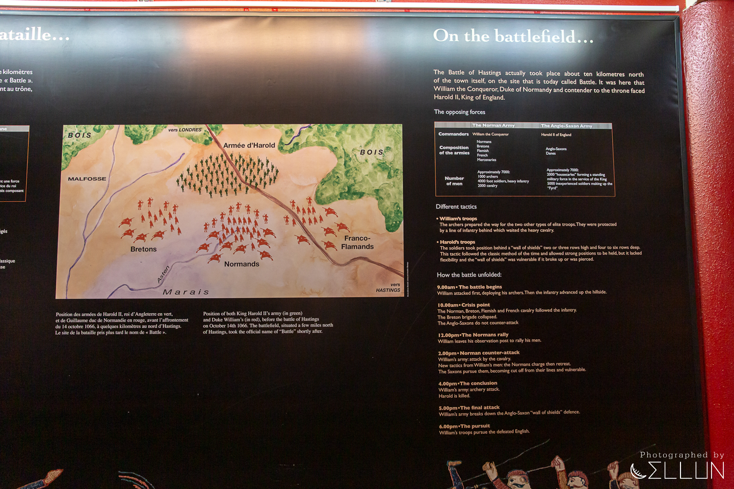박물관 마지막은 처음 지나왔던 바이외 태피스트리 모습이 인쇄된 벽면에 각각의 사물이나 인물에 대한 자세한 설명을 볼 수 있습니다.