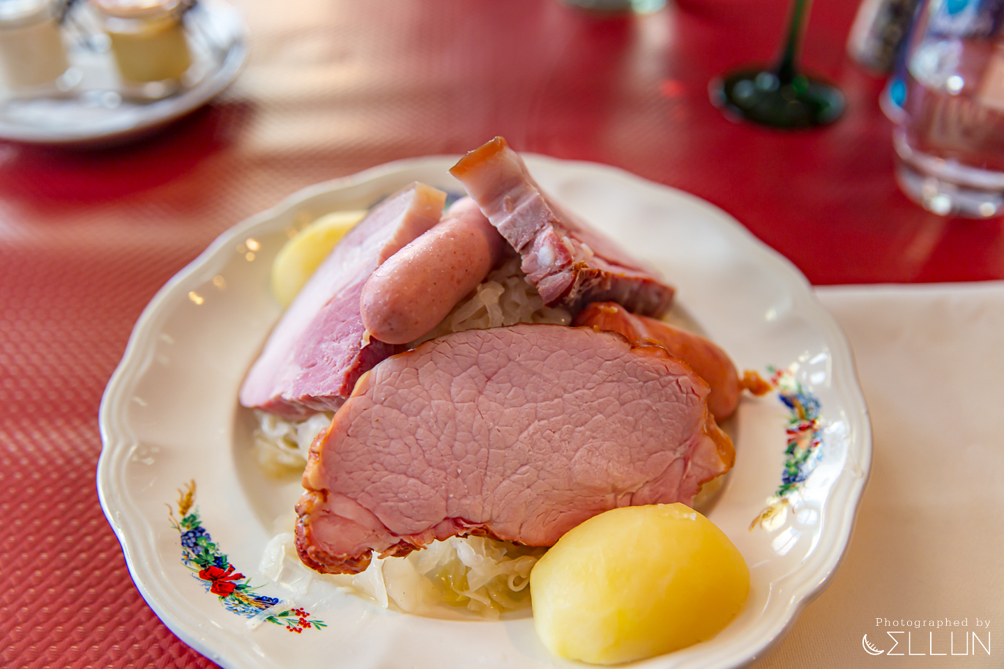 그리고 드디어 메인인 슈크루트가 나왔습니다. 정확히는 가운데 채썰린 양배추가 슈크루트고 고기와 함께 곁들인 위의 요리는 슈크루트 가르니(Choucroute Garnie)라고 합니다.