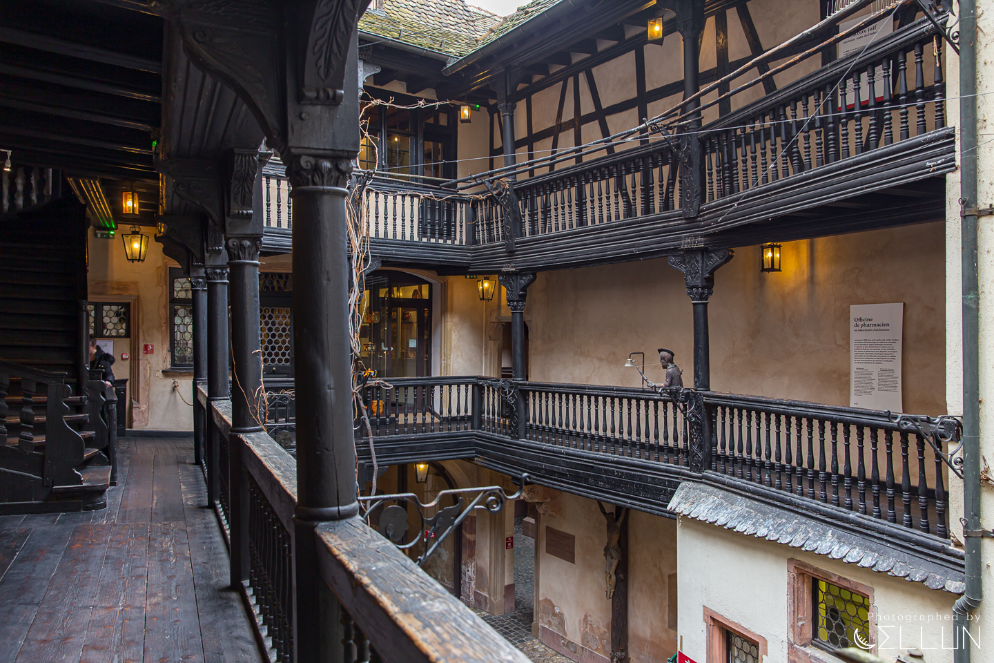 전시실을 지나면 이렇게 중앙 실외공간으로 나오게 됩니다. 옛스런 분위기가 사방으로 펼쳐져서 마치 한옥 안에 들어와있는 듯한 느낌도 납니다. 유럽 건물답게 중앙부분이 실외로 되어있는데, 파리의 건물들은 중정이 넓어서 내부를 정원이나 주차장으로 쓰는데, 알자스 전통주택은 중앙 실외부분이 작아서 채광과 통로역할로 대신하는 듯 합니다.