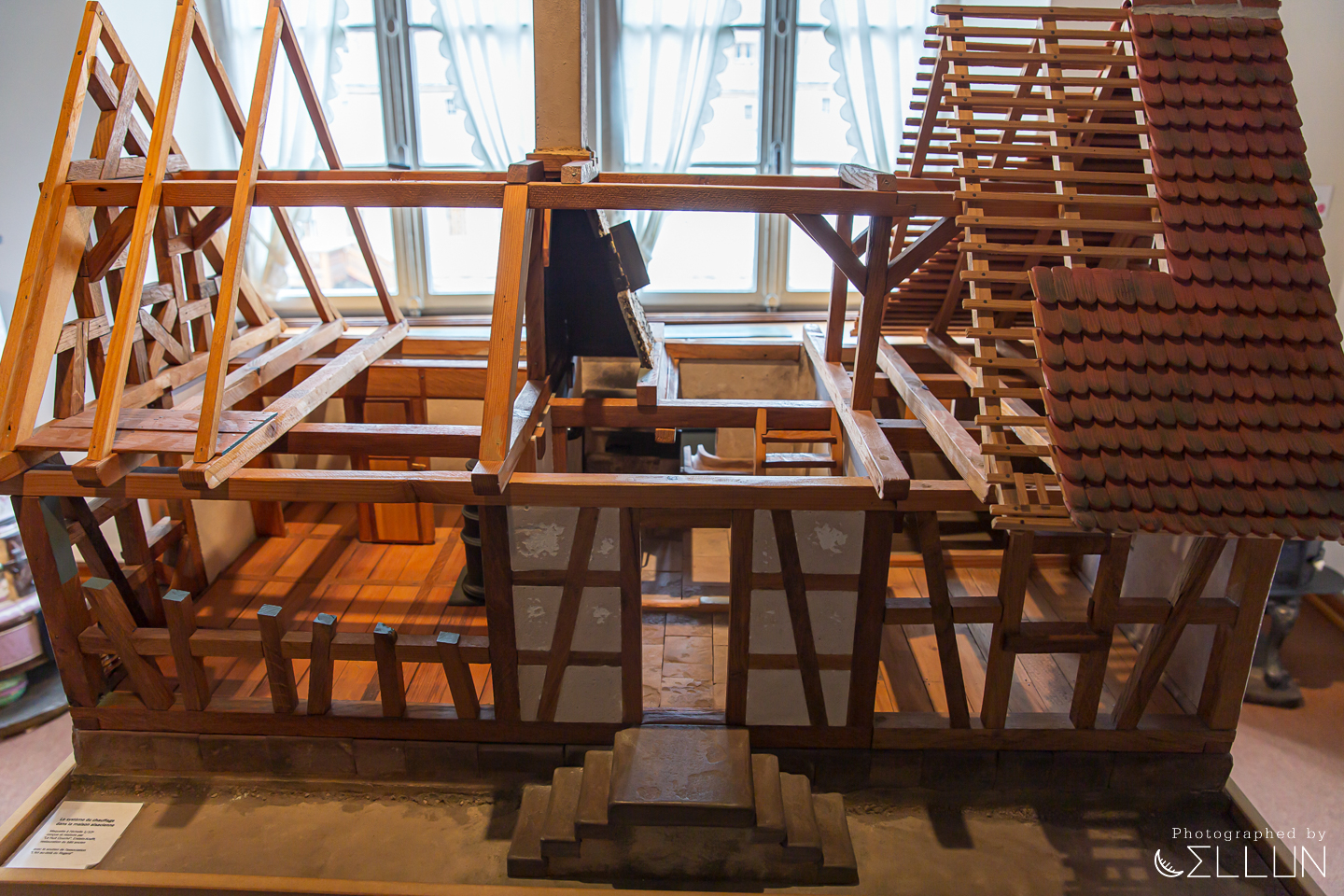 박물관이 전통양식으로 지어진 건물에 있어 천장과 바닥, 계단 등 전체적인 시설에서부터 민속적인 느낌을 받을 수 있었습니다. 박물관의 첫 부분은 쁘띠 프랑스에서 잘 구경할 수 있는 알자스 지방 전통주택의 건축적 양식에 대한 유물과 전시를 볼 수 있습니다. 세모난 지붕에 반목조로 지어진 것이 알자스 건축물의 뚜렷한 개성이 어떻게 구성되어있는지 들여다볼 수 있습니다.