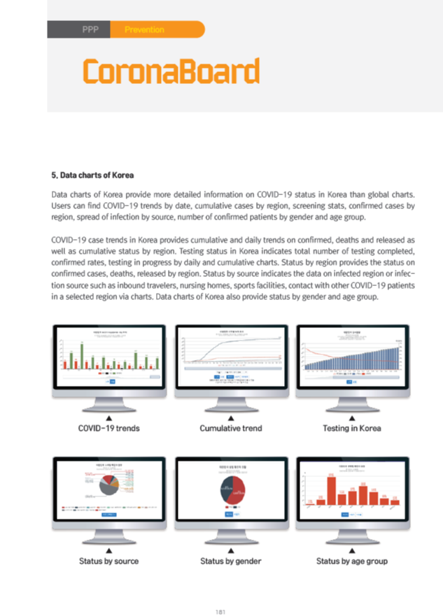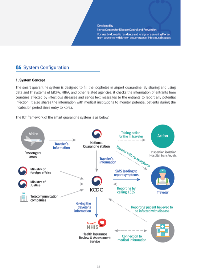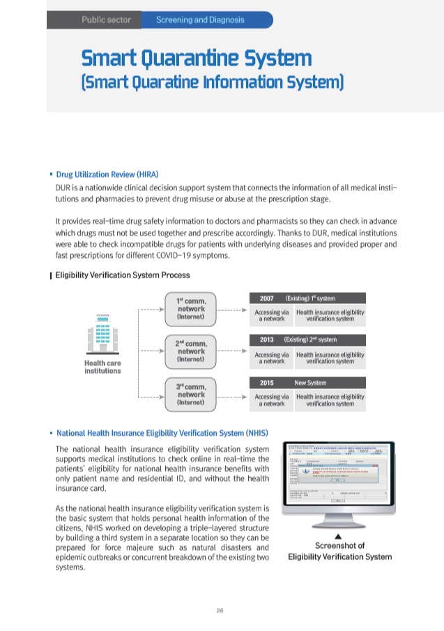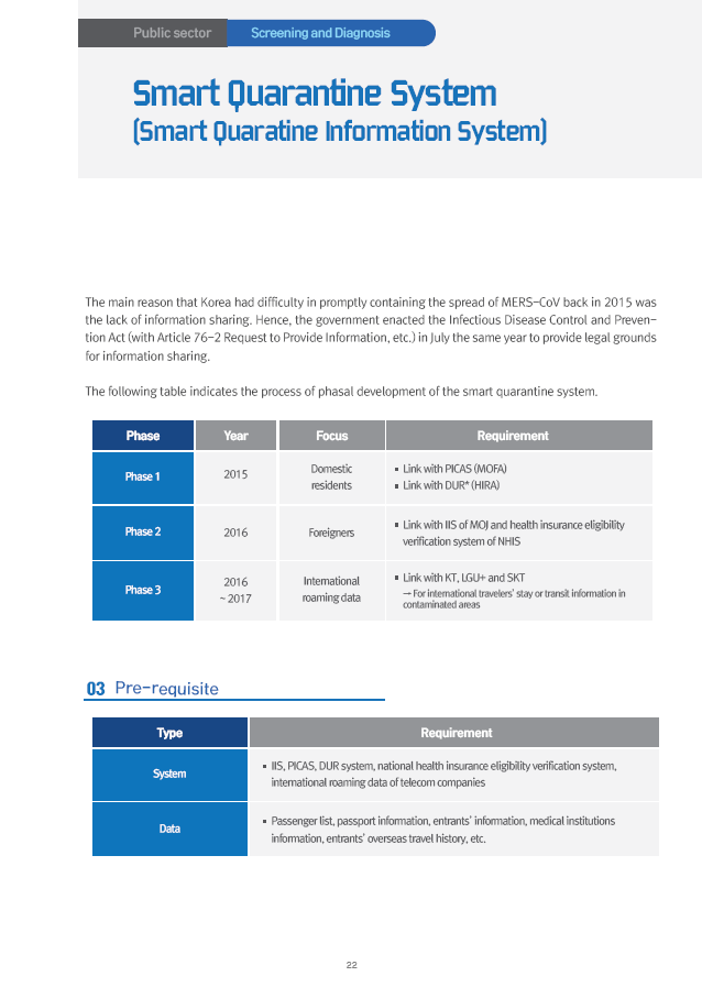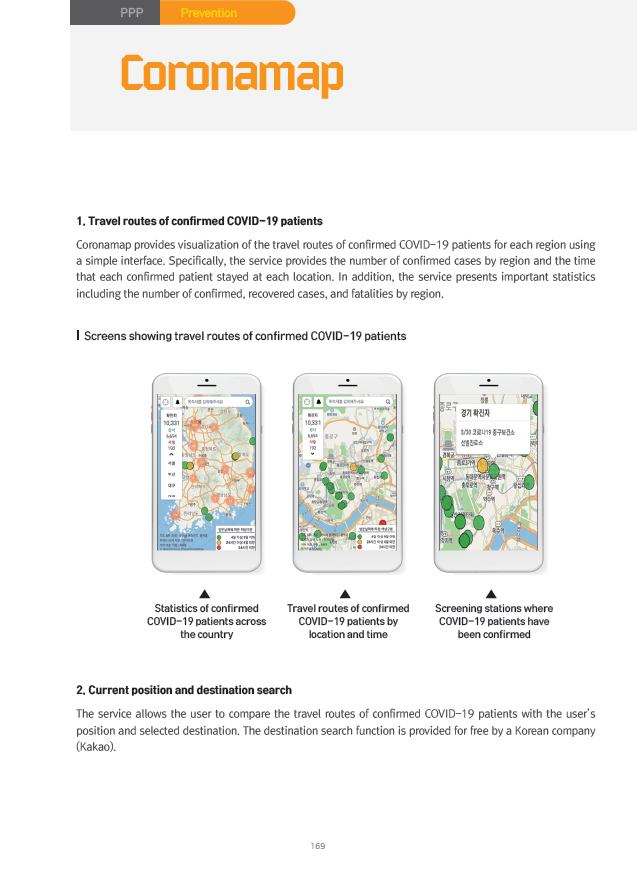 This report describes 27 systems on public sector and PPP(Public-Private Partnership) at each steps, such as 'Screening and Diagnosis Stage', 'Epidemiological Investigation Stage', 'Patient and Contact Management Stage' and 'Prevention Stage'. These systems contain not only computer system but mobile apps, physical facilities or experimental equipments etc.