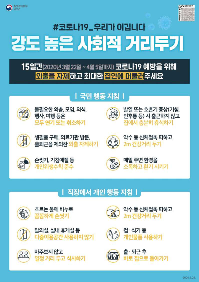 In addition, Korea has a feature of making successful preventing the spread of viruses while keeping the level of infringement of the people's freedom low through the guideline for the action, called '사회적 거리두기'(social distancing). Therefore, the prevention system of Korea is regared as a benchmarking model for other countries.