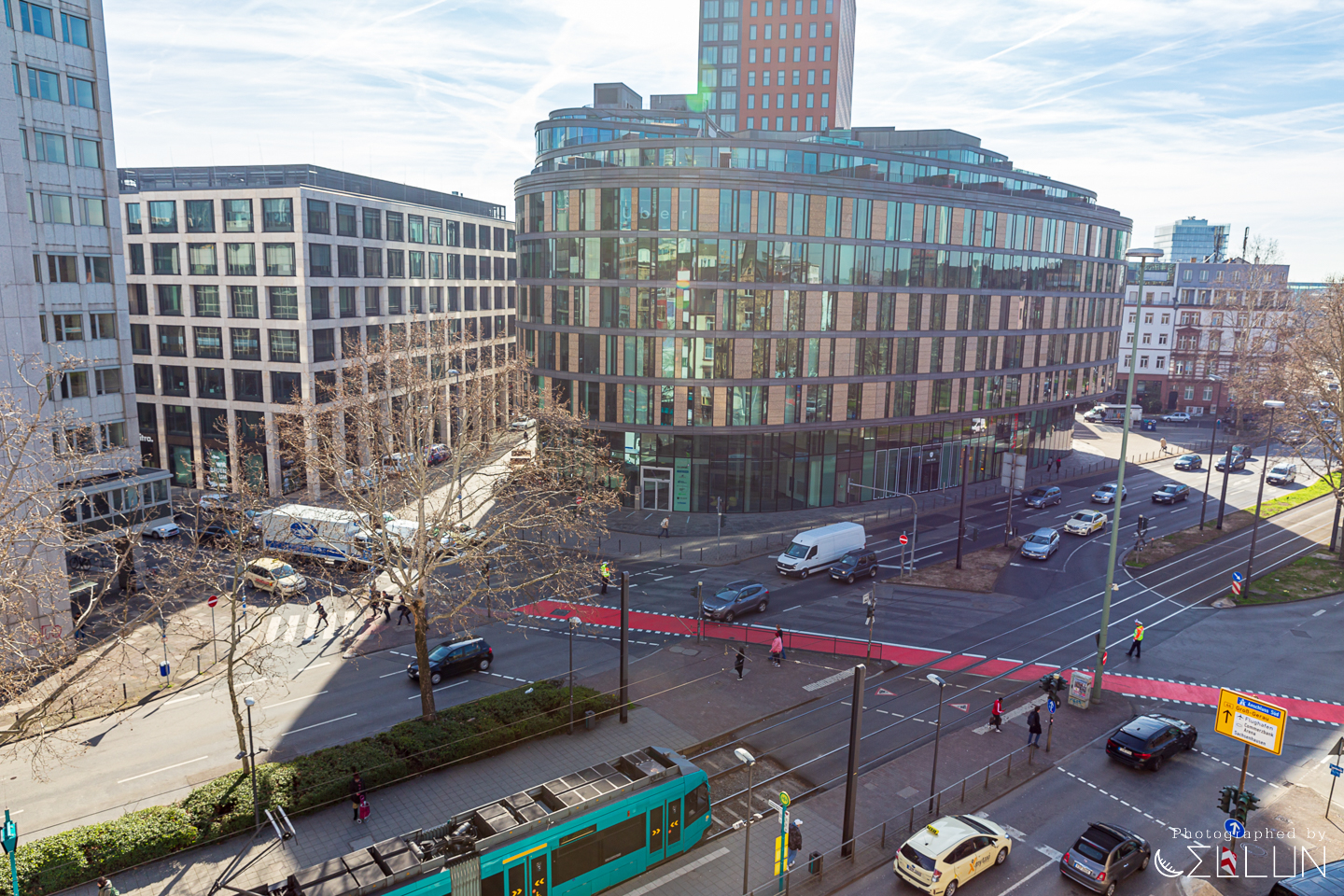 관광지 구역이 아니라 평범한 현대적인 건물이 보이는 뷰인데, 건물 너머로 프랑크푸르트의 상징인 고층건물들이 머리를 빼꼼히 내밀고 있는 모습이 잘 보입니다.