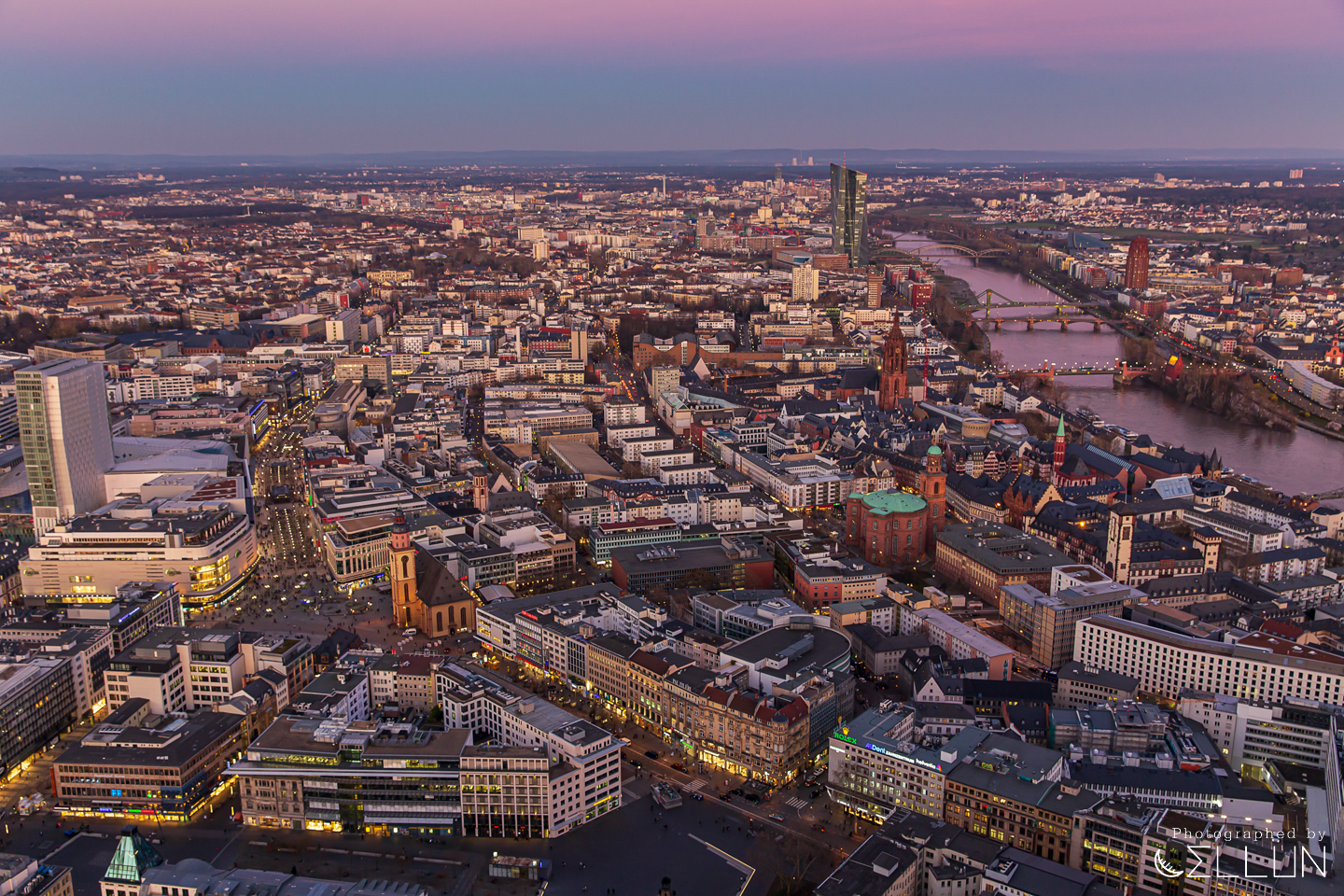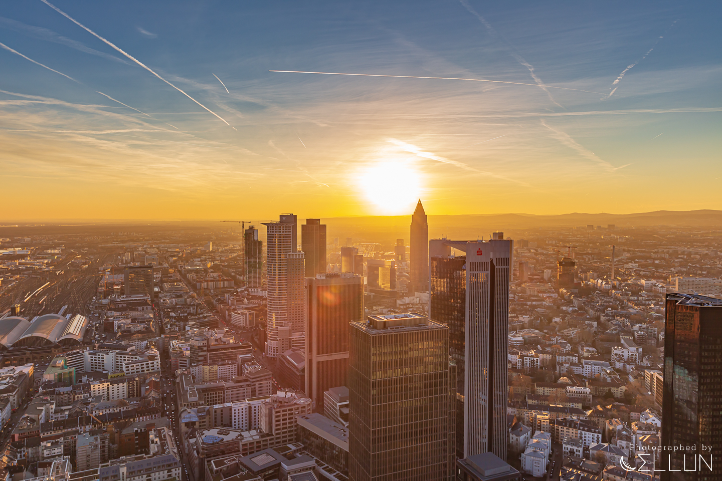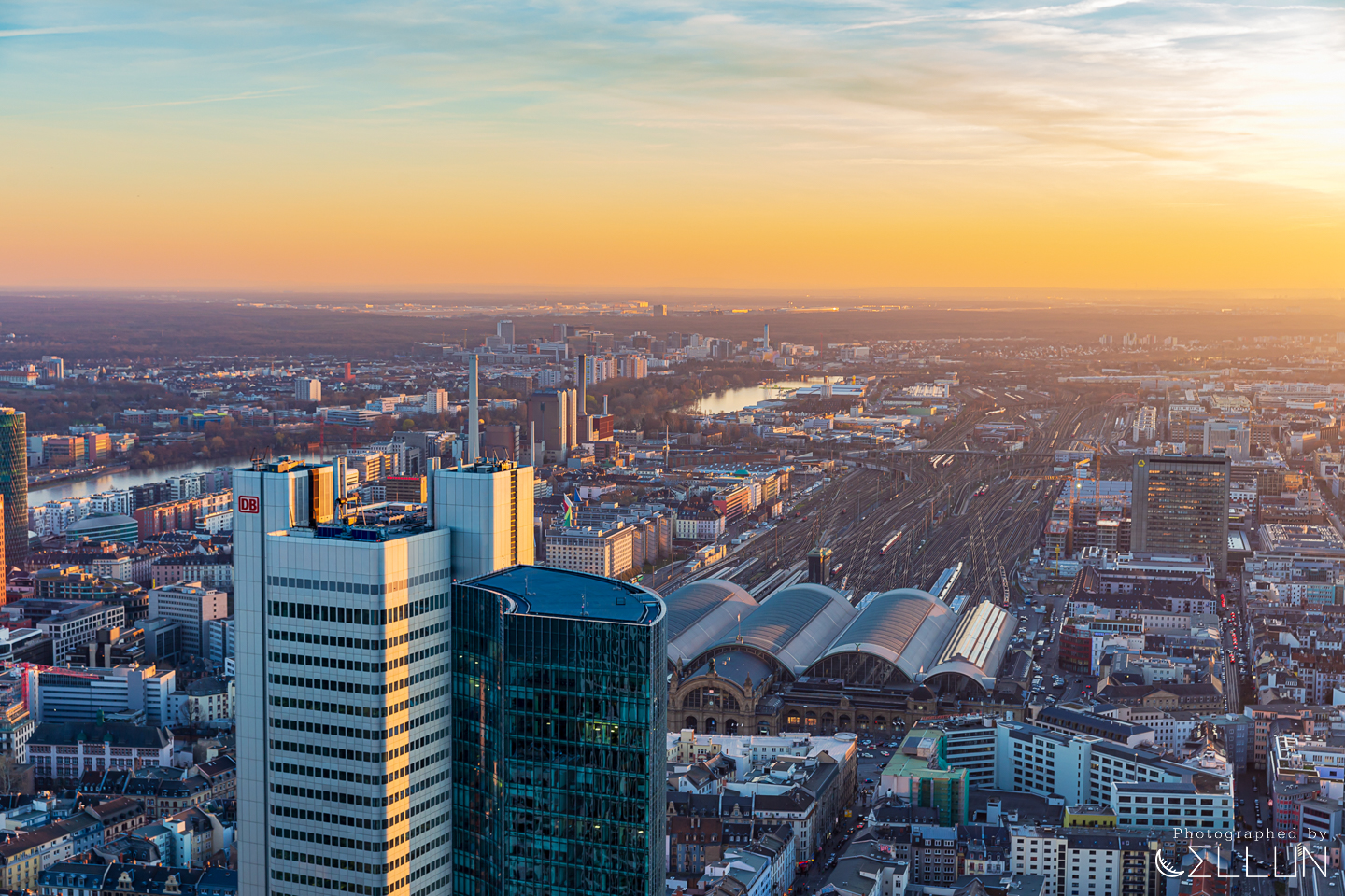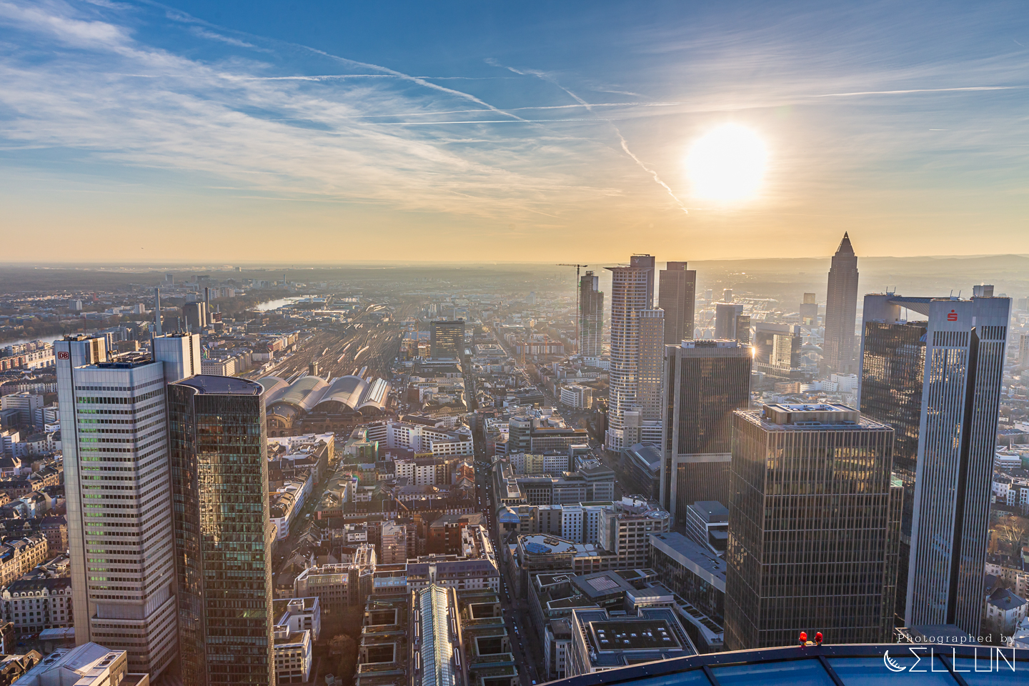 서쪽 방향으로는 줄지어 늘어선 프랑크푸르트의 고층건물과 중앙역의 모습이 보입니다.